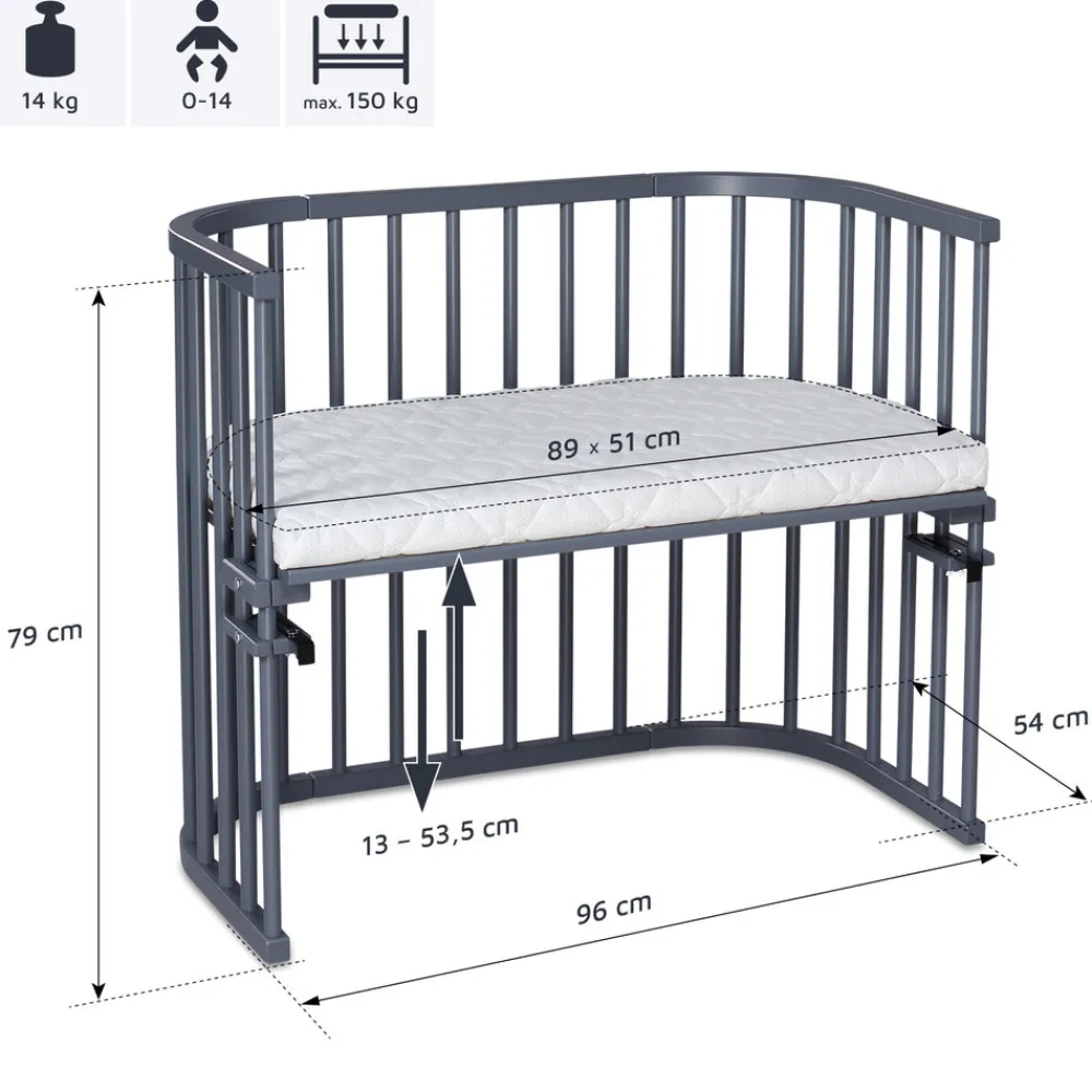 På grund af sin solide konstruktion kan bedside crib’en bære belastninger på op til 150 kg og kan derfor modstå belastningen fra en voksen.