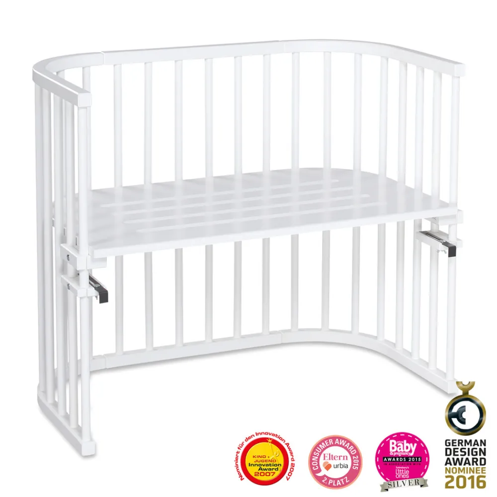 babybay® Maxi er en ekstra stor bedside crib. Den generøse store liggeflade er ideel til tvillinger eller hvis du ønsker mere plads til din baby. Takket være den unikke, patenterede og uendeligt justerbare højdeindstilling kan liggefladen indstilles præcist til enhver sengs højde – uden trin, uden mellemrum. Altid i samme niveau som voksensengen – det er essensen af en bedside crib – så du altid har din lille skat tæt på dig.