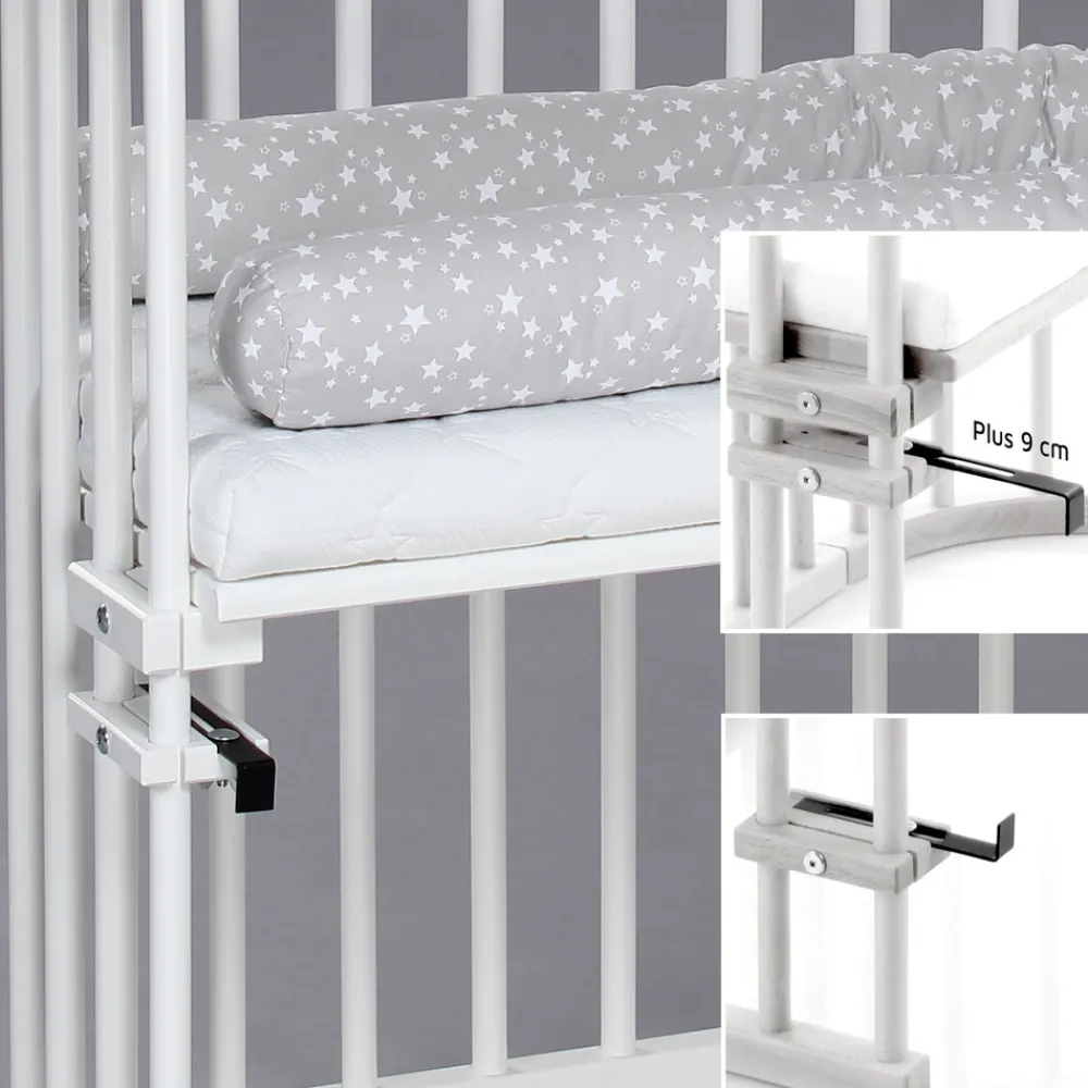 På grund af sin solide konstruktion kan bedside crib’en bære belastninger på op til 150 kg og kan derfor modstå belastningen fra en voksen.