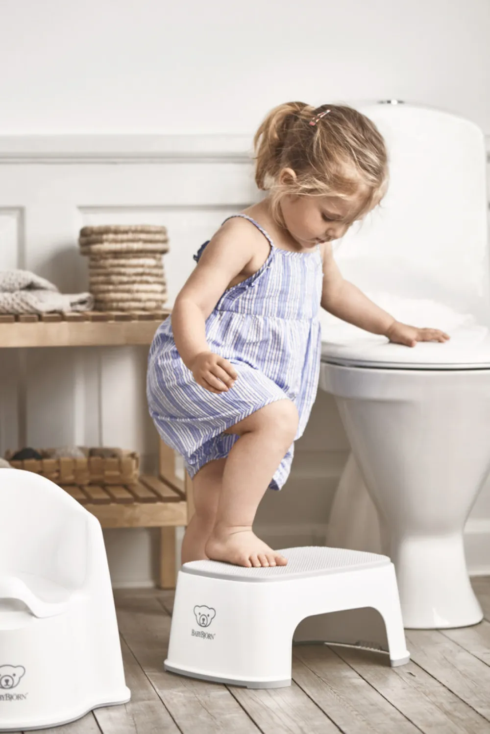 BABYBJÖRN børnetaburet gør det nemt for dit barn at nå toilettet eller badeværelse vasken alene. Skammelen har en skridsikker gummioverflade, der giver et godt greb, selvom dit barn har våde fødder. Taburettens smarte design og premium-materiale giver den en lang levetid med mange anvendelsesområder for både børn og voksne.