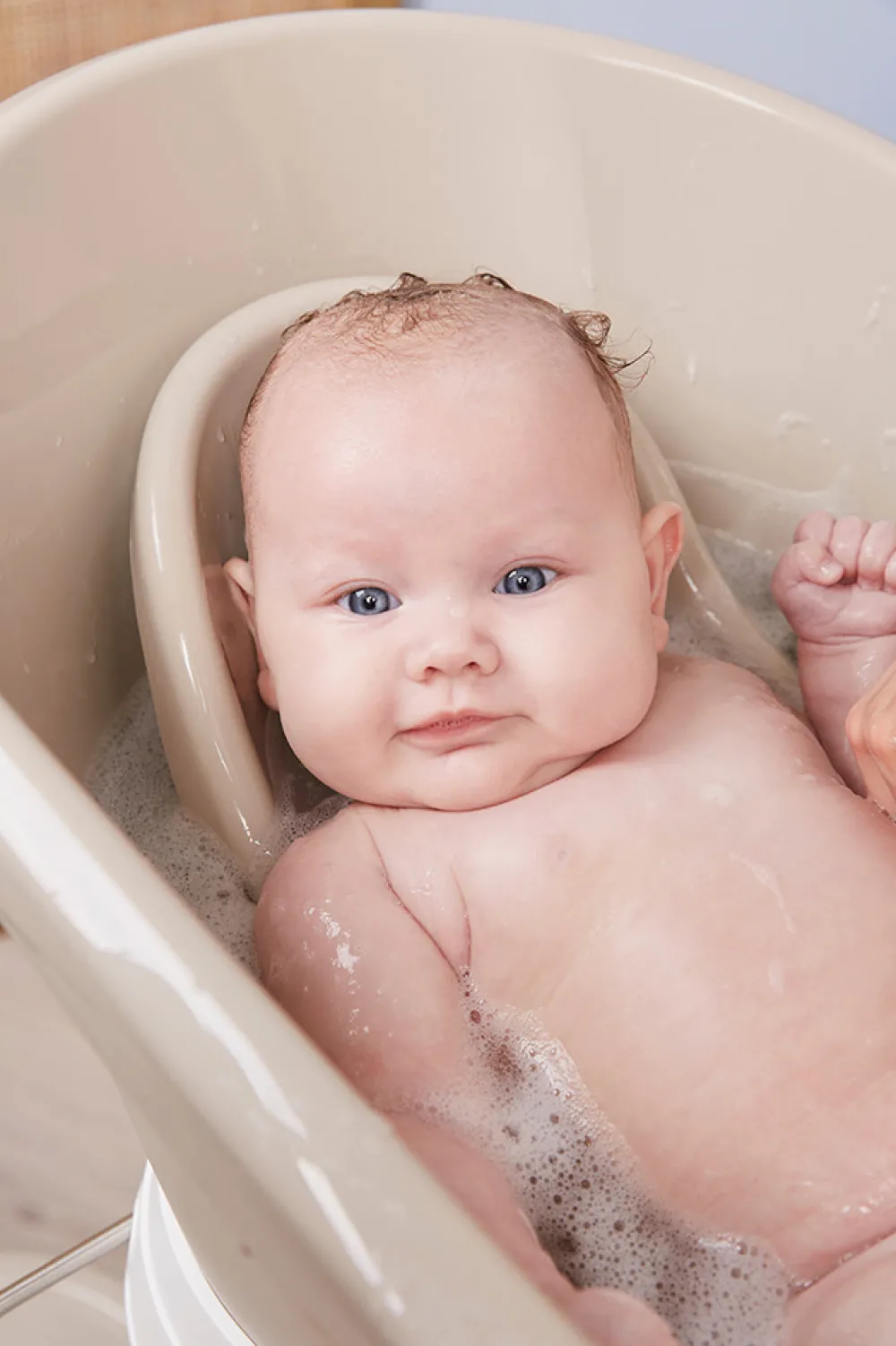 Den nye og sikre badestol til nyfødte hjælper med til, at du kan holde begge hænder frie til at pusle din baby. Stolen giver en komfortabel og sikker støtte således at babyen ikke kan glide væk.