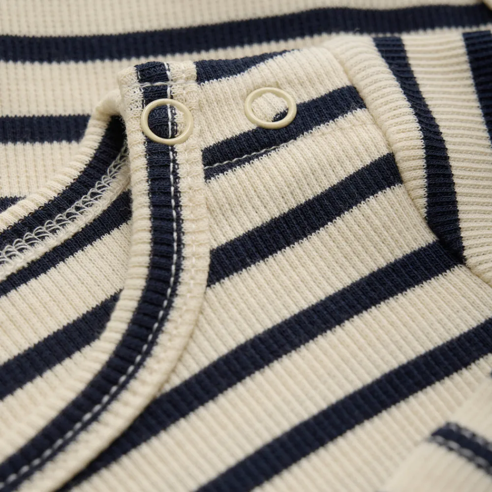 Blød og behagelig body i ribbet bomuld med klassiske striber. Den langærmede design giver ekstra varme, perfekt til køligere dage. Trykknapper i skridtet og på skulderen gør det nemt at tage bodyen af og på. En hverdagsfavorit til små opdagelsesrejsende!
