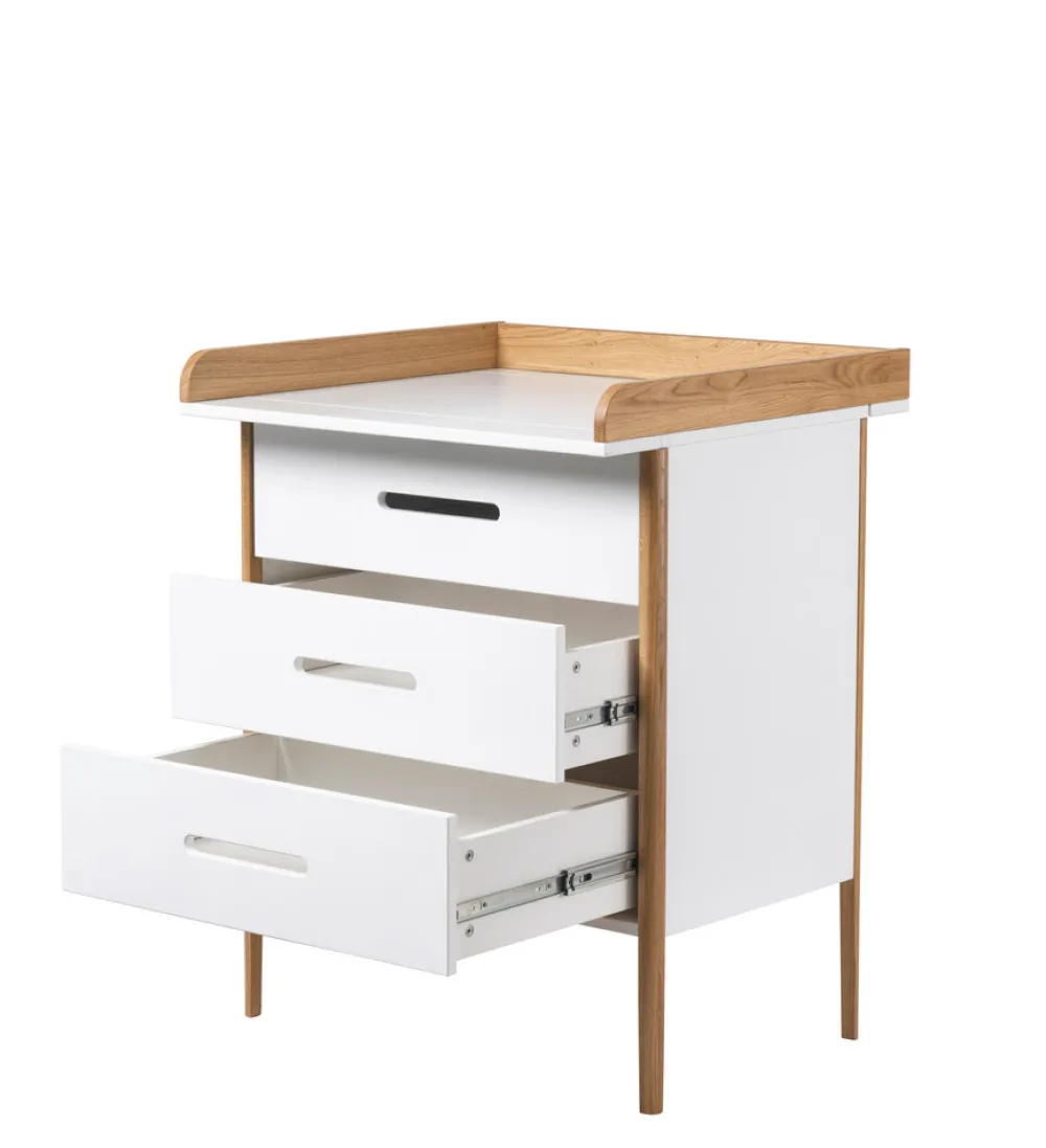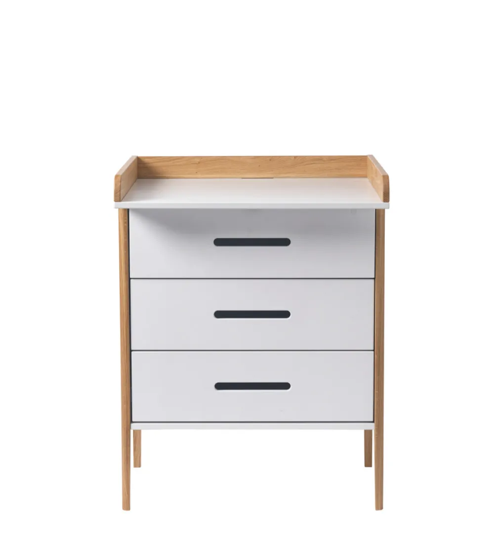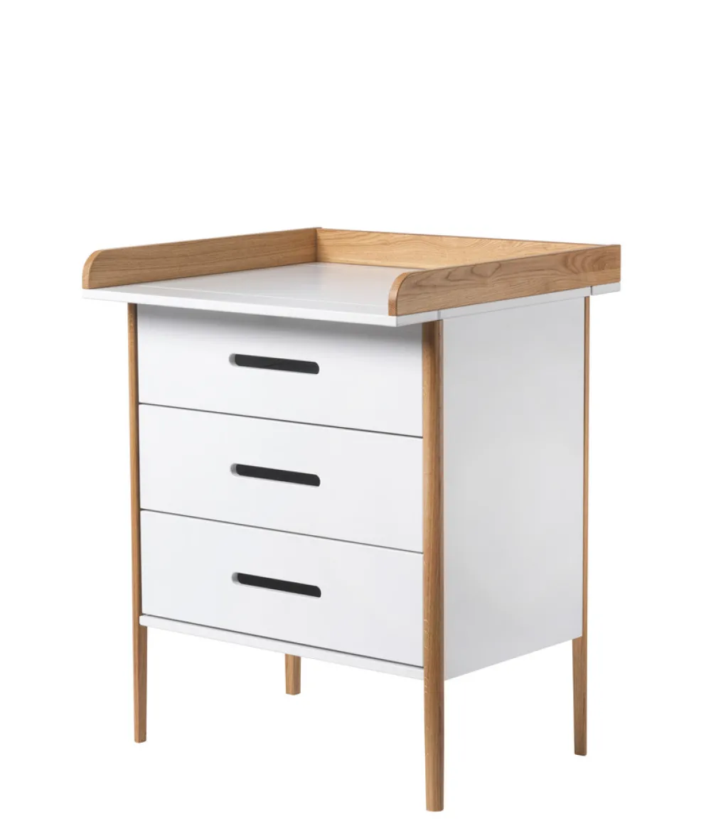 Når der skal skiftes ble, skiftes tøj eller hygges efter badet, er det vigtigt med en overskuelig og funktionel pusleplads. Spoke puslekommoden har tre rummelige skuffer, der giver god opbevaringsplads til alt det nødvendige.