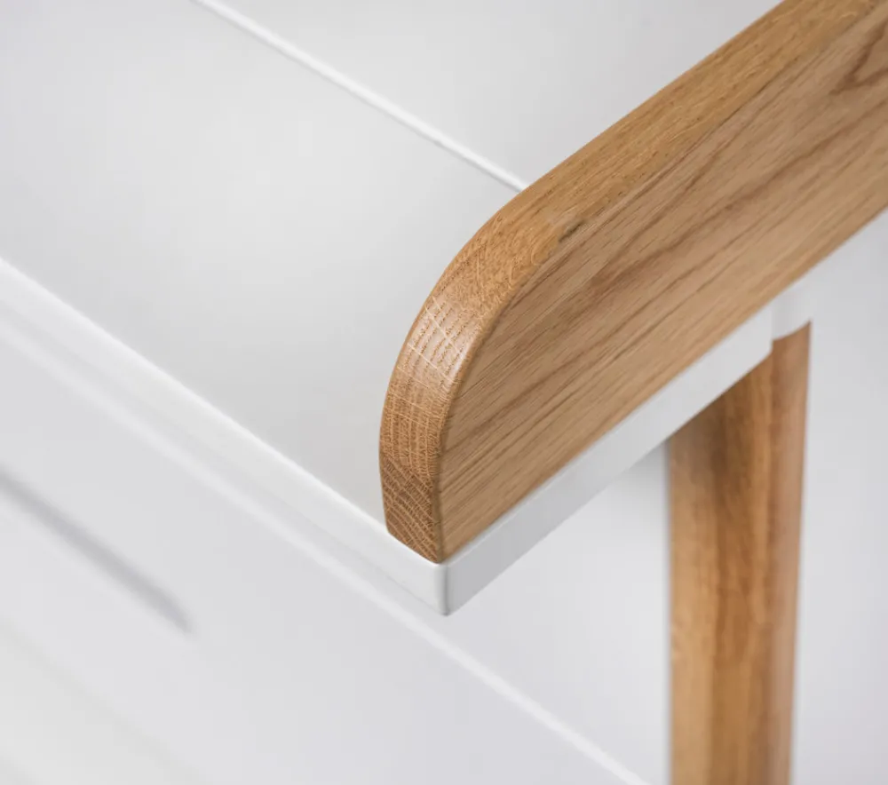 Den store pusleplade monteres ovenpå kommoden – helt uden at lave huller – og kan nemt fjernes igen, når pusletiden er ovre. Dermed får du en stilfuld kommode, der kan bruges til opbevaring af tøj, legetøj eller andet. Spoke skaber en tryg og praktisk ramme om barnets første år og tilføjer karakter til børneværelset.