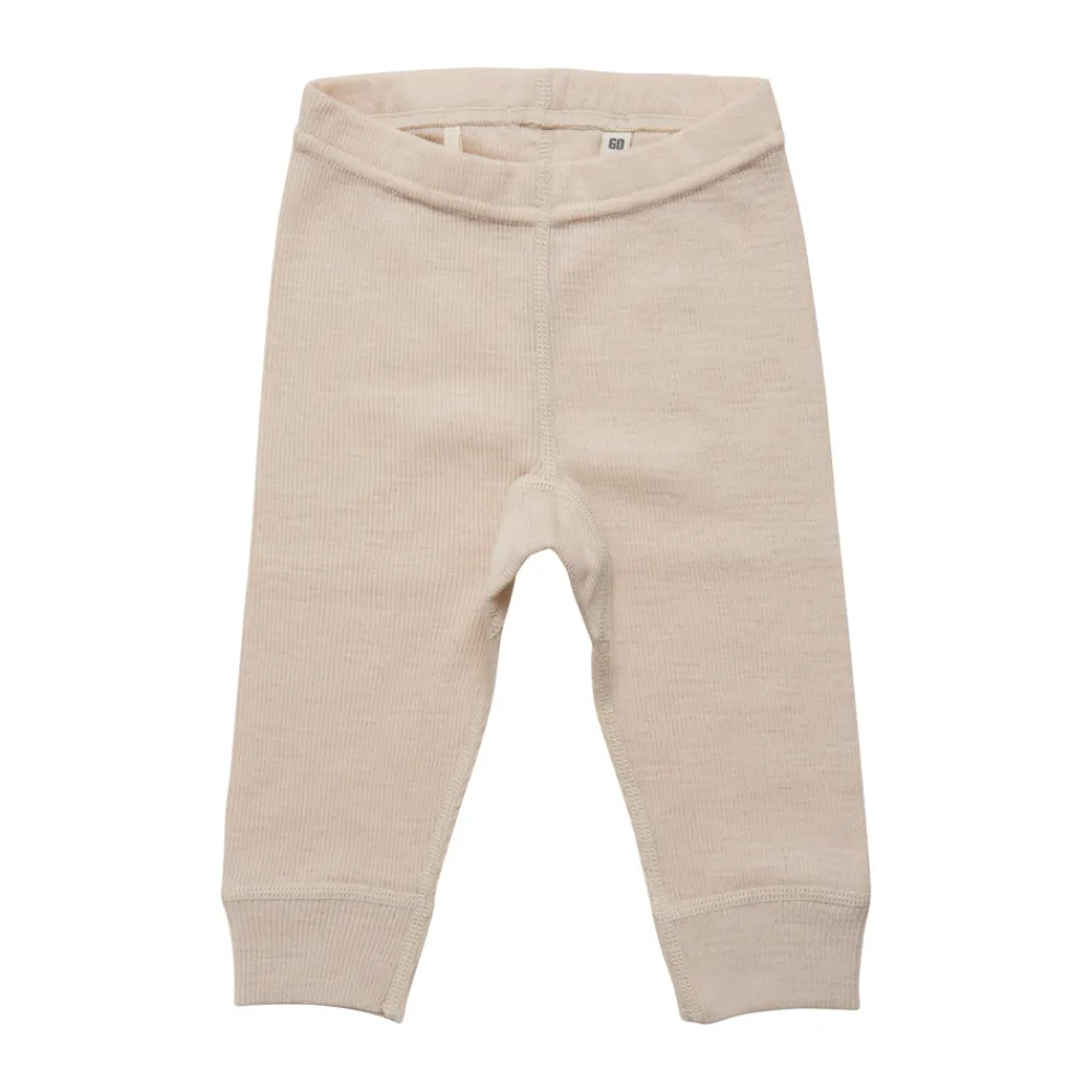 Bløde uld leggins til de mindste i en blød rib merino uldkvalitet, og er perfekt til de kølige dage. Legginsene er med elastik i livet og rib afslutning. Kan bruges alene, eller som undertøj på de kolde dage. Merino uld er godt til efterår og vinter, da den er temperaturregulerende, og derfor hjælper med at holde en stabil kropstemperatur. Samtidig er det svedtransporterende og åndbart, så barnet lettere forbliver tør.