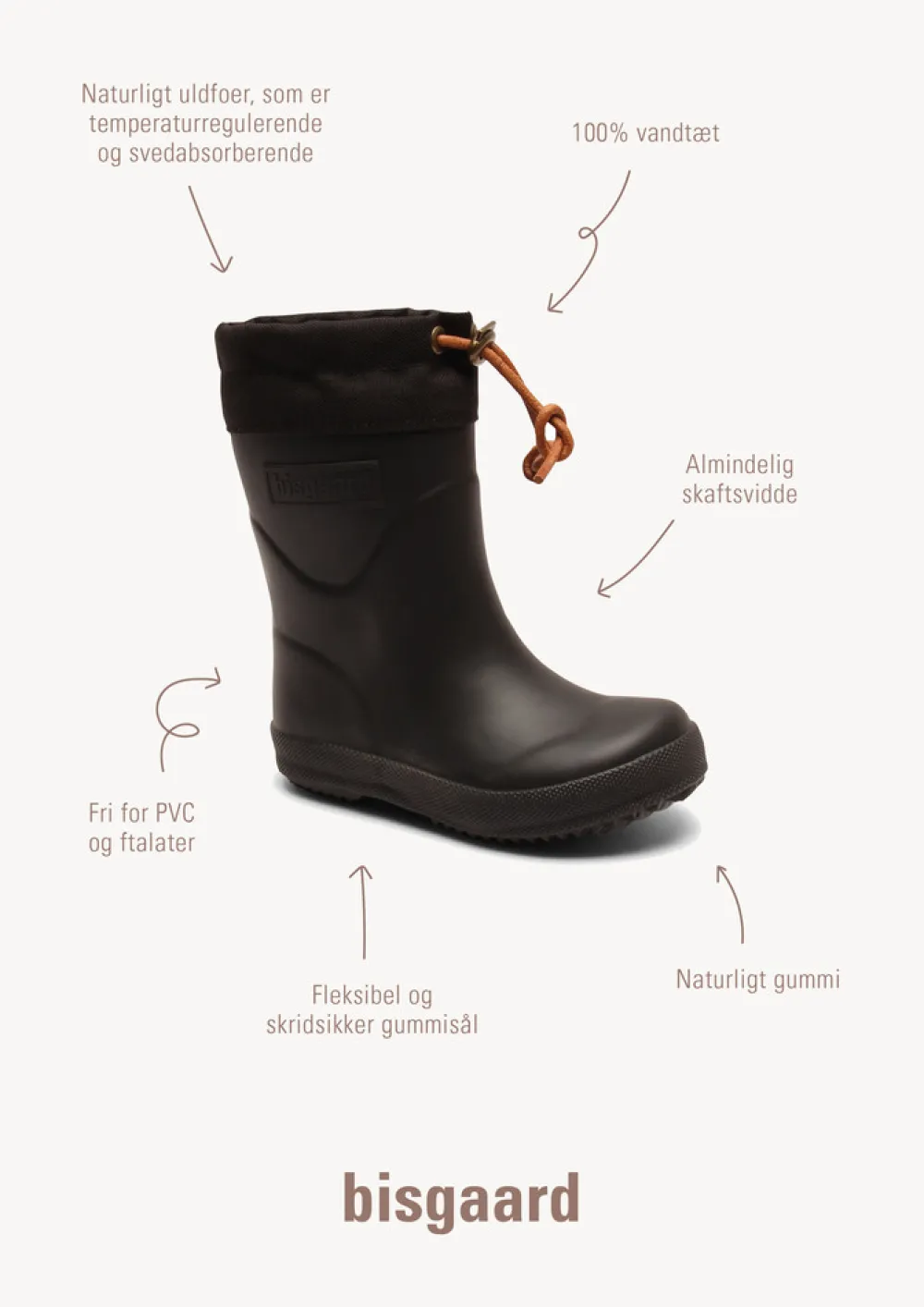 Termogummistøvle med almindelig skaftvidde, der giver god støtte og stabilitet. Termogummistøvlen er produceret i vandtæt naturgummi foeret med uld, der er et temperaturregulerende og svedabsorberende naturmateriale, som holder fødderne tørre og varme.