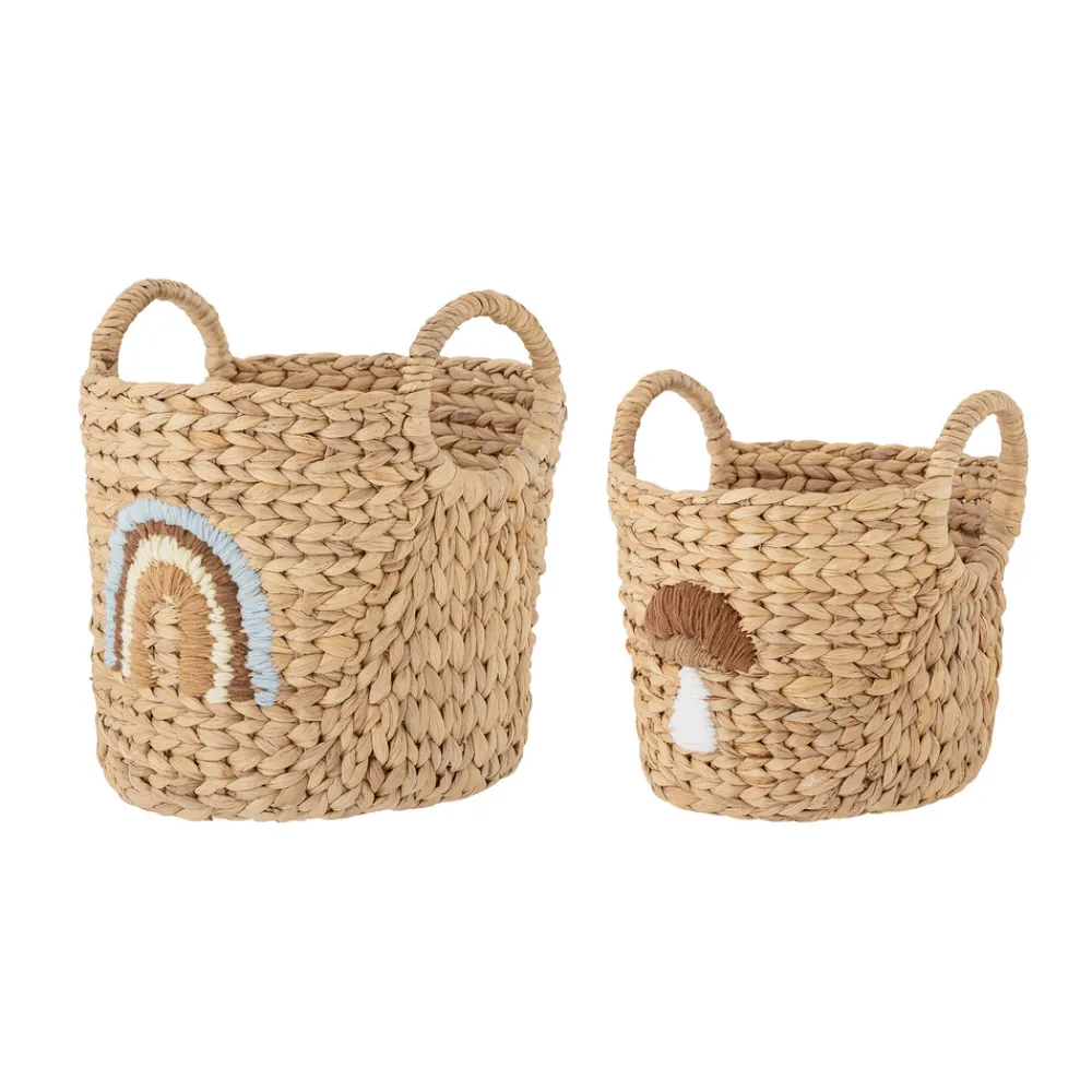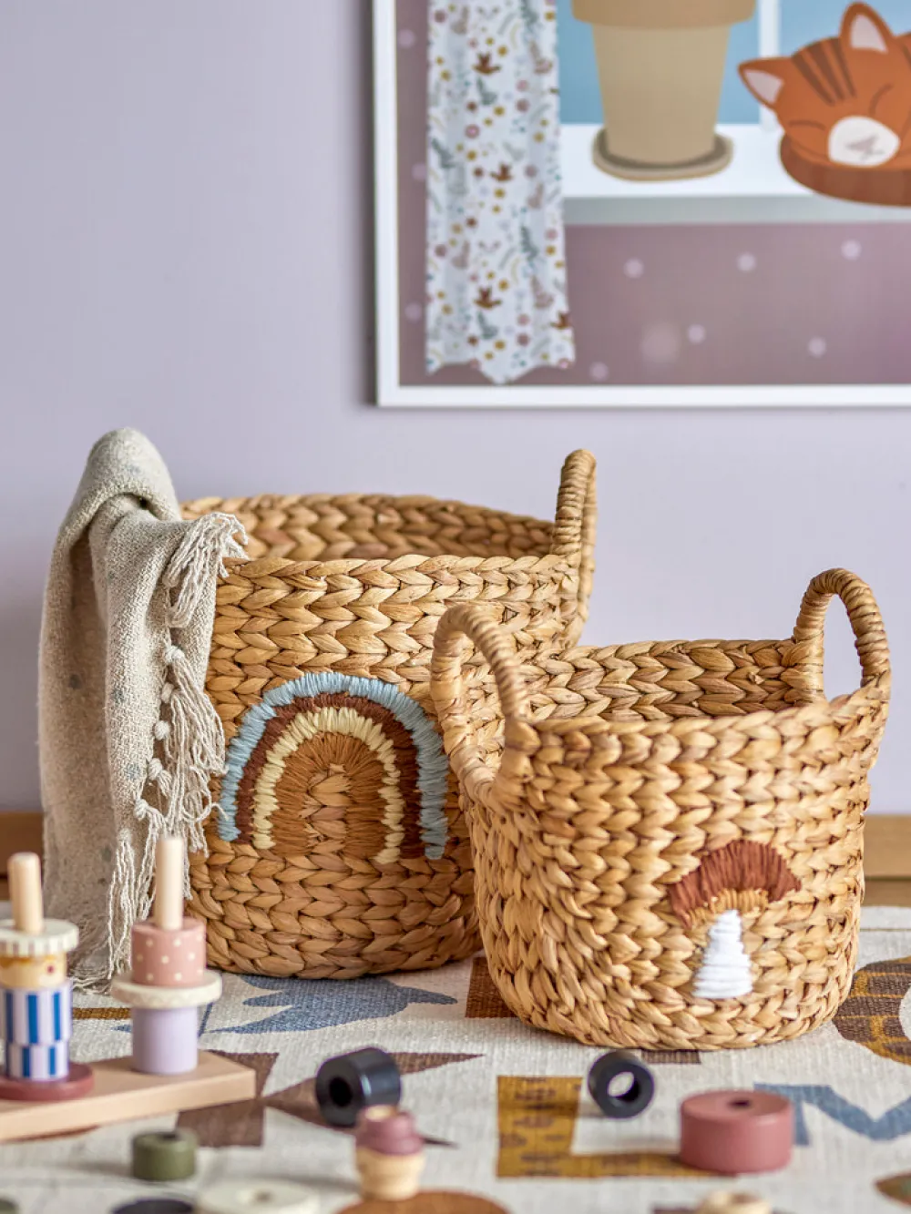 Agnes kurven fra Bloomingville MINI er et sæt af to smukke kurve, som er praktiske og dekorative på samme tid. Kurvene har håndtag og kommer i to forskellige størrelser, hvilket gør dem perfekte til opbevaring af legetøj og bamser. Den ene kurv er broderet med en fin regnbue, mens den anden har en sød svamp broderet på. Begge kurve er flettet i vandhyacint, hvilket giver dem et naturligt og organisk look. Med Agnes Kurvene kan du skabe orden på en smuk og hyggelig måde.