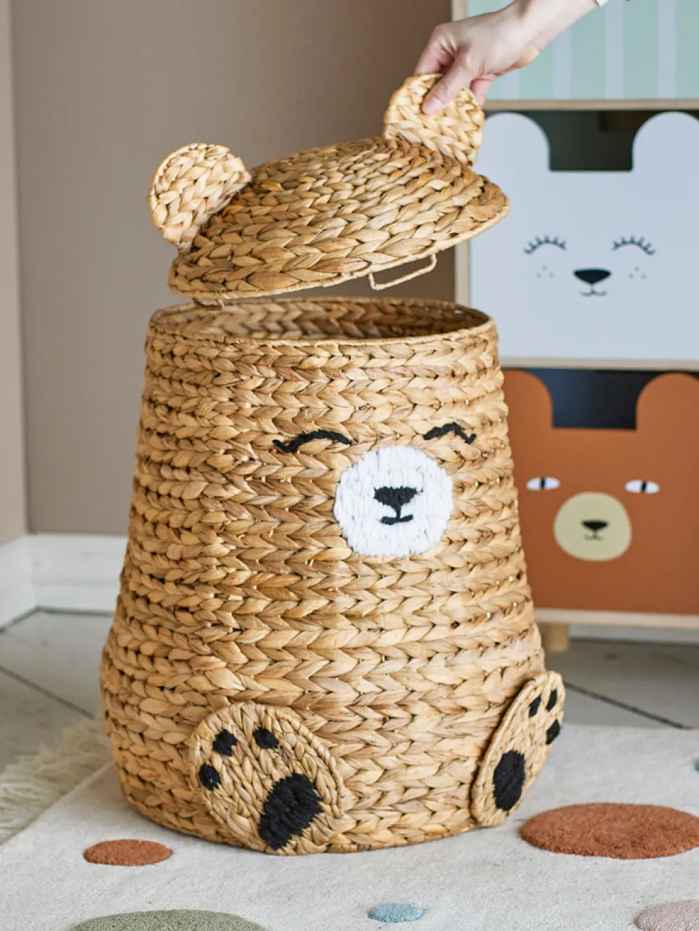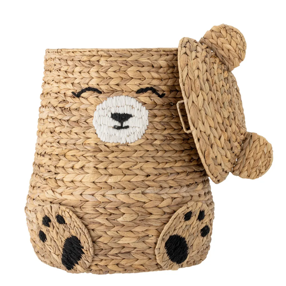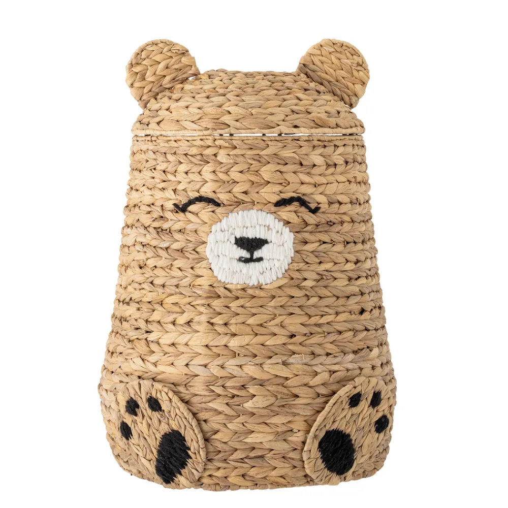Timone Kurv m/låg fra Bloomingville MINI er ideel til opbevaring og på samme tid en sjov legekammerat. Den store bjørnekurv holder styr på alt legetøjet og skaber et hyggeligt udtryk i ethvert rum. Kurvens låg kan tages af, så det er let for de små hænder at få fat i bamser og legetøj samt gemme det væk igen. Kurvens udtryk kan variere alt efter hvilken sæson materialet bliver høstet i.