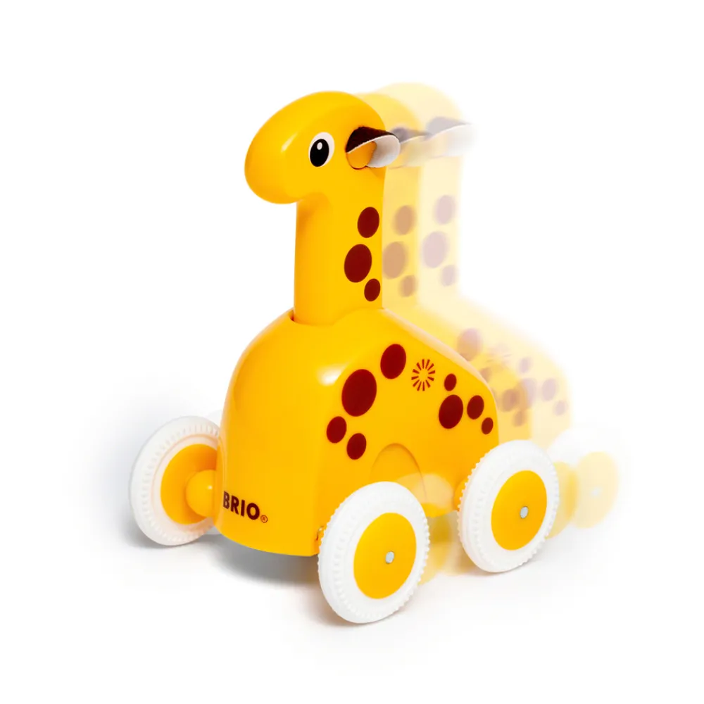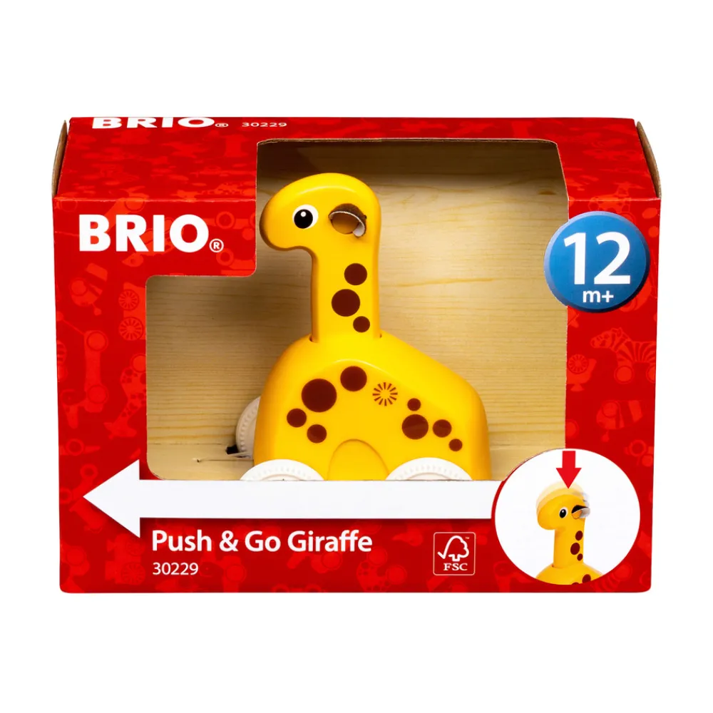 Gør dig klar til jagten med 30229 Push & Go Giraf fra Brio. Denne søde giraf er den perfekte ven til små børn, der er ved at lære at kravle og gå. Tryk på hovedet, og legetøjet til små børn går af sted med god hastighed! Alderstilpasset design med enkel mekanik, som børn på 1 år nemt kan forstå. Fremstillet i en kombination af FSC-certificeret europæisk bøgetræ, kvalitetsplastik og filtmateriale. Dette legetøj vil med sikkerhed få alle til at smile. Fra 12 måneder.
