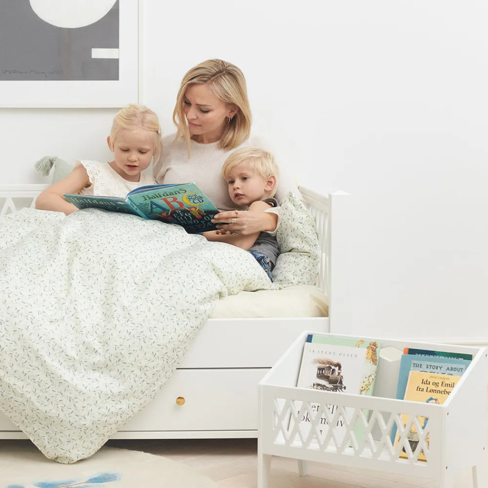 Harlequin Bogkassen tilbyder elegant og praktisk opbevaring til alle yndlingsbøgerne, som hele tiden flyttes rundt i huset fra værelse til værelse. Passer perfekt ind i dagligstuen ved siden af sofaen eller legemadrasserne til en hyggelig læsestund, eller sæt den ved siden af senge på værelset så yndlings godnat bogen er lige indenfor rækkevide. Designet giver barnet mulighed for at se og bladre gennem en række bogomslag og vælge dagens favorit.