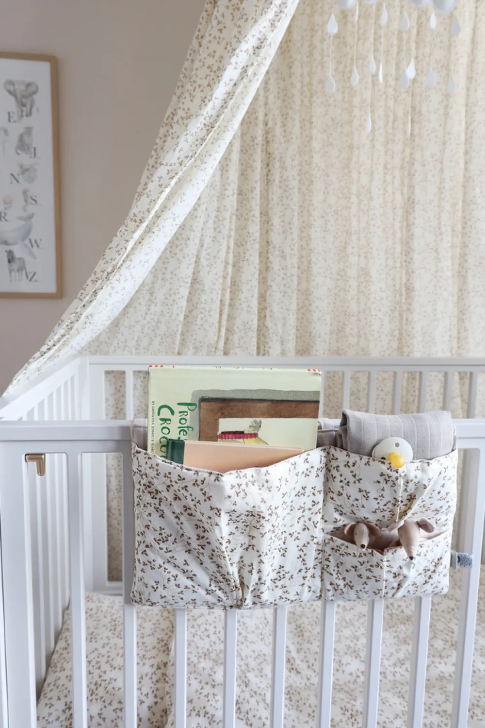 Praktisk og pæn sengelomme til at hænge på tremmesengen, så sutter, bøger, nusseklude og andre sengetidsnødvendigheder altid er lige ved hånden.