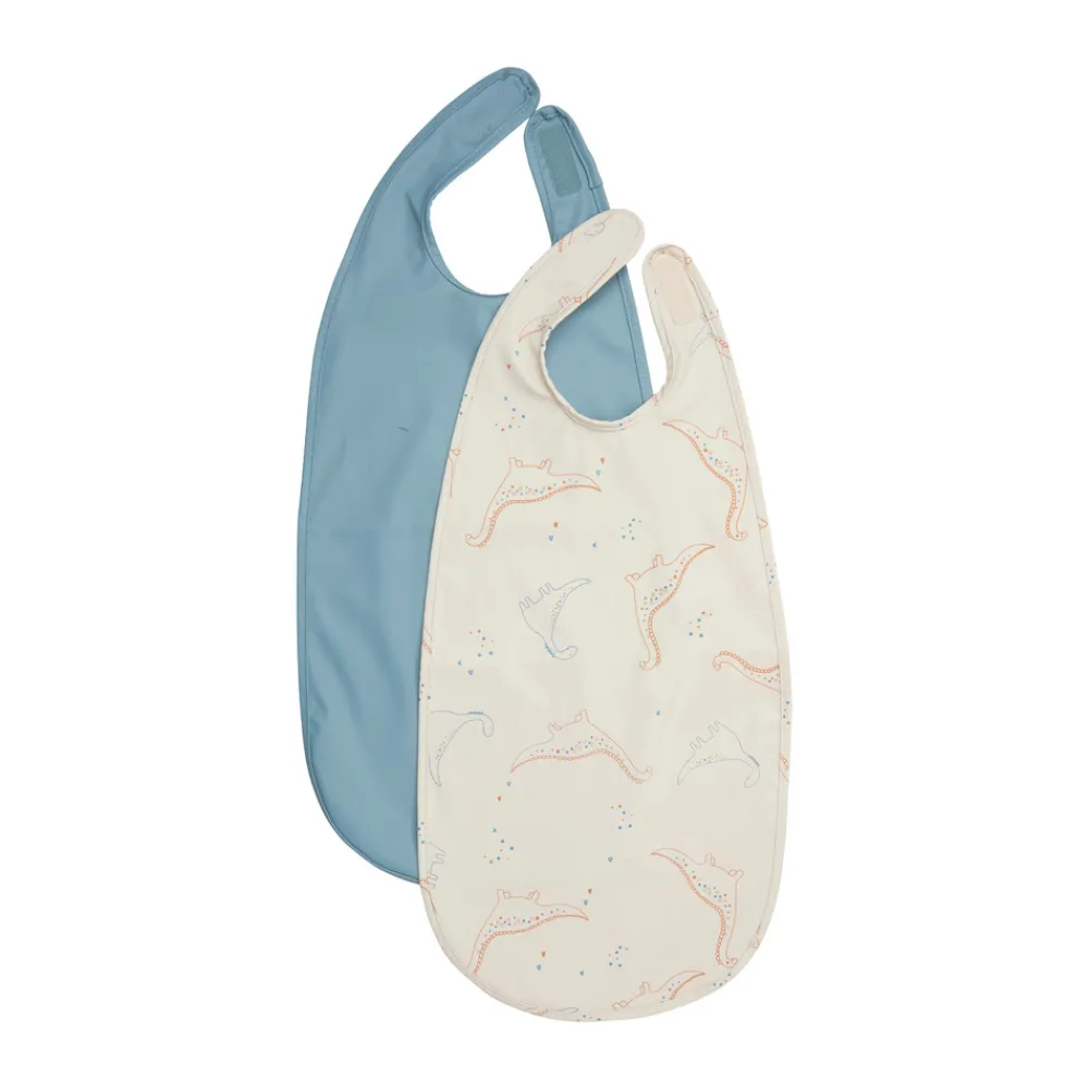 2-pak lange hagesmække i PU fra CeLaVi. Hagesmækken lukkes med velcro bagpå. Pakken består af en hagesmæk med all-over print og i ensfarvet.