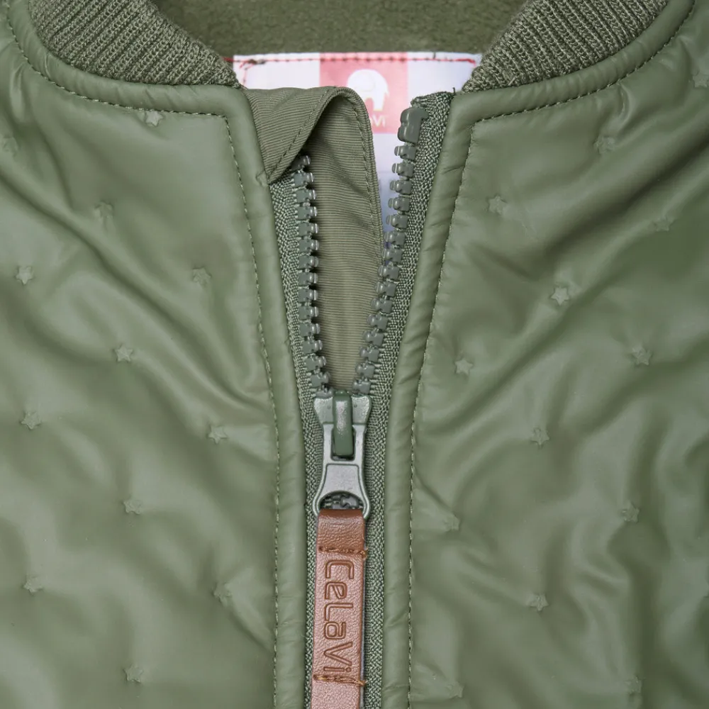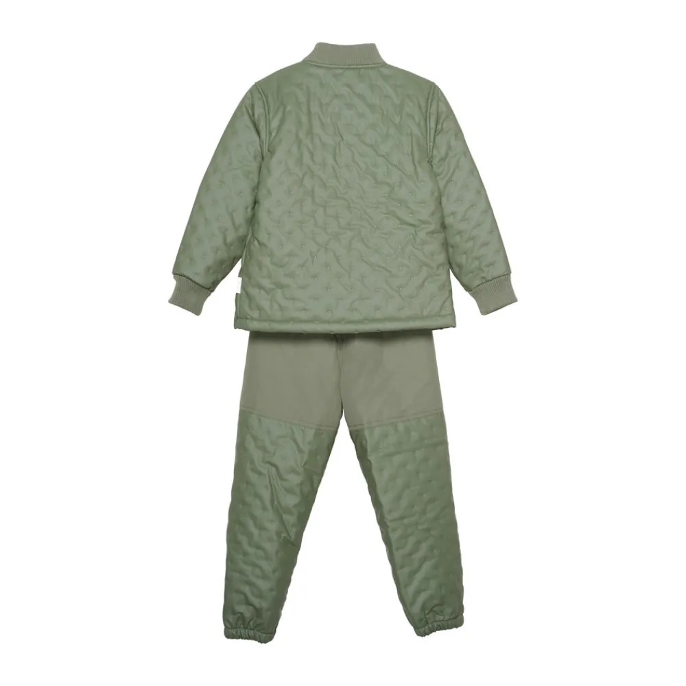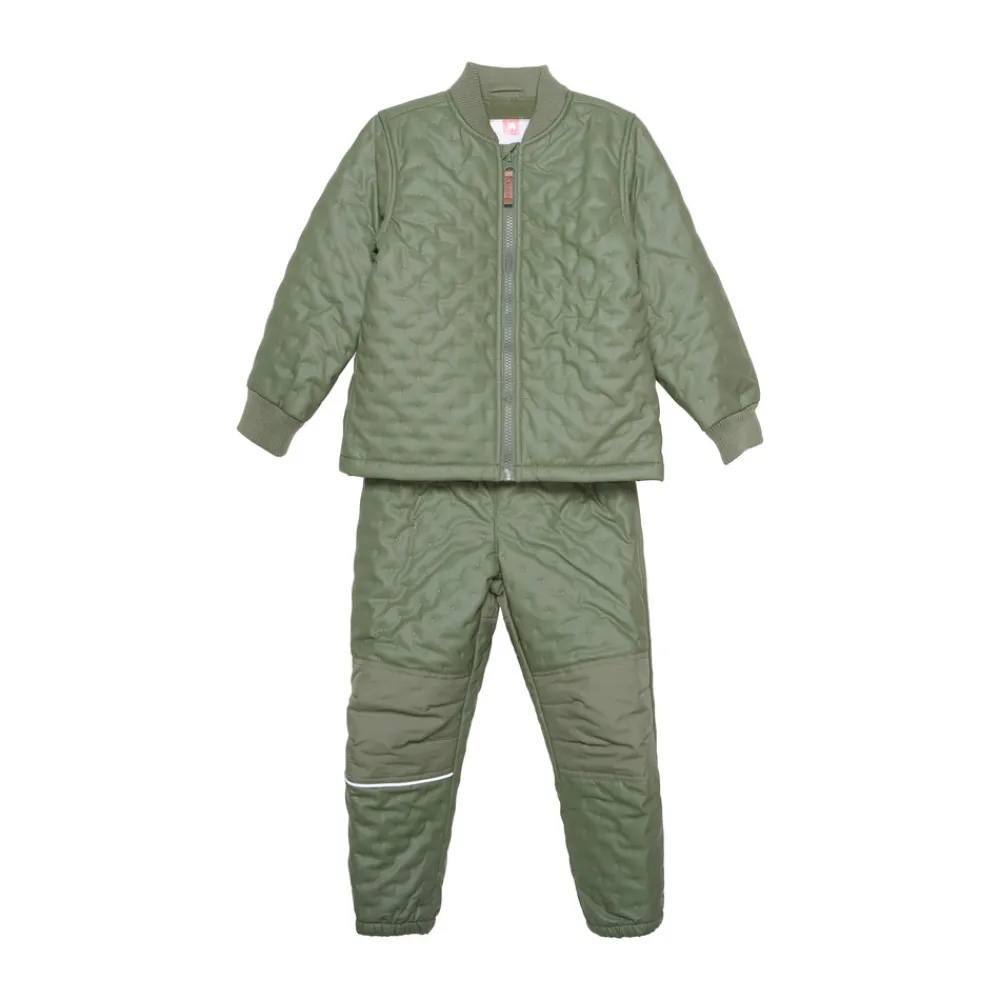 Termotøj med PU-belægning, som gør termotøjet vandtæt. Derudover er sættet foret indvendigt. Ekstra forstærket på knæ og bagpå på bukserne. Bukserne har desuden elastik i talje og ved ankler. Jakken har ribkant ved hals og håndled samt lynlåslukning. CeLaVi-logo foran.