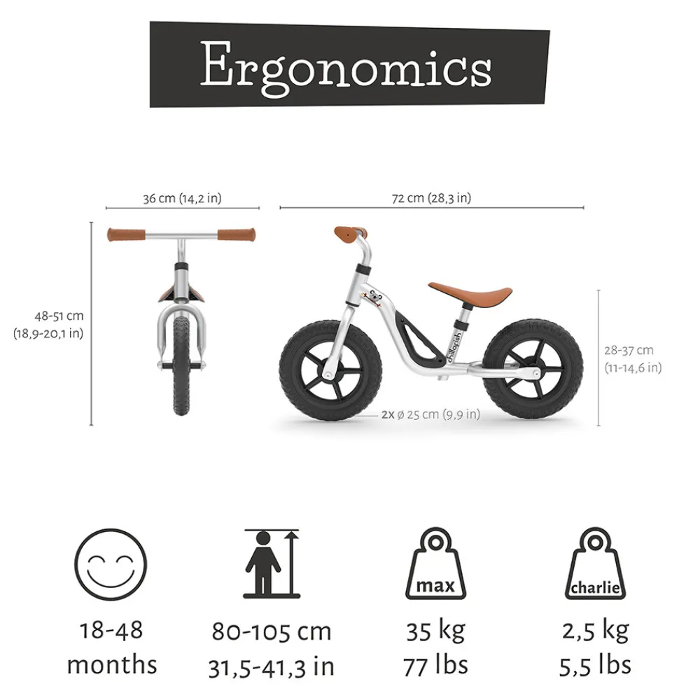 Chillafish Charlie er en hyperletvægts 10″” balancetræner med punkteringssikre dæk og en metalramme af høj kvalitet, der kun vejer 2,5 kg. Det perfekte legetøj til at træne dit lille barns grovmotorik, balance og styring .
