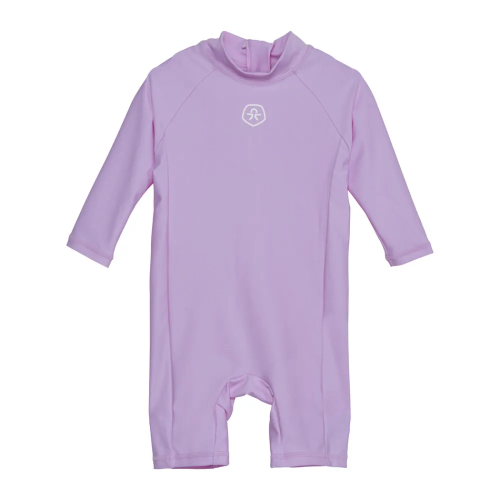 Smart ensfarvet svømmedragt fra COLOR KIDS med UPF80 (Ultraviolet protection factor). Dragten har lange ærmer og korte ben. Dragten lukkes bagpå med en lynlås. Dragten har COLOR KIDS logo i midten.