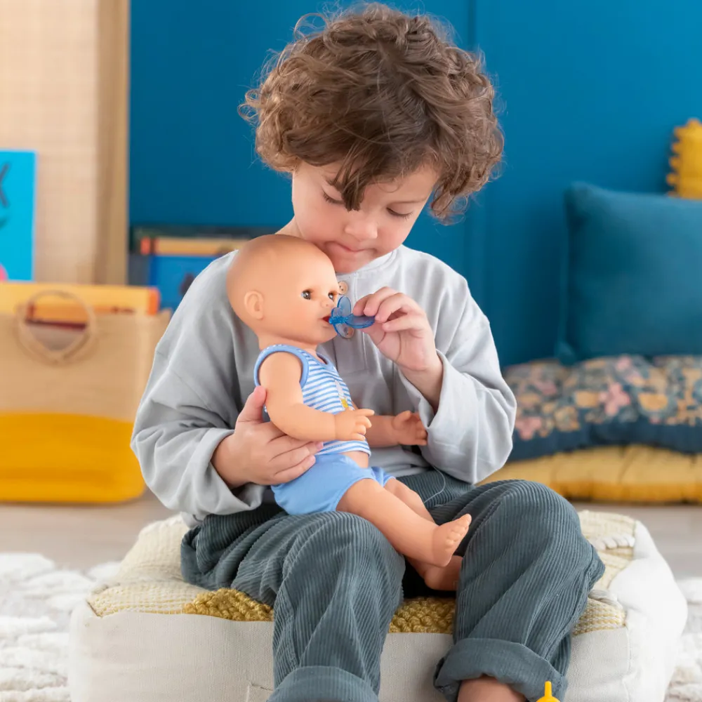 Dukken har sovende øjne, der lukker, når den lægges ned, hvilket gør den ideel til puttetid. Den kan også sutte på sin tommelfinger, hvilket giver en ekstra dimension til legen. Med denne babydukke kan dit barn udvikle sine omsorgsevner og have timevis af sjov.
