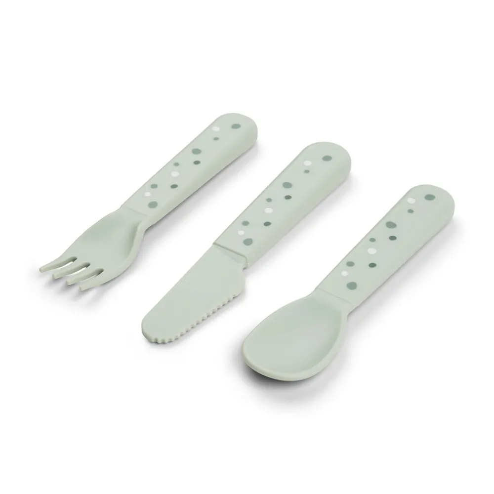 Foodie bestiksættet med Happy dots har afrundede kanter, som gør det sikkert og behageligt for dit barn at øve sig i at spise med bestik. Børnebestiksættet passer perfekt til små hænder og er gennemtestet af børn. Det søde bestiksæt til babyer og tumlinger består af en ske, en gaffel en og kniv. Efter utallige familiemiddage og børnefester kan bestikket affaldssorteres som plast og genanvendes til fremstilling af nye hverdagsprodukter. Bestikket har en mat, silkeblød overflade og matcher resten af Foodie kollektionen.