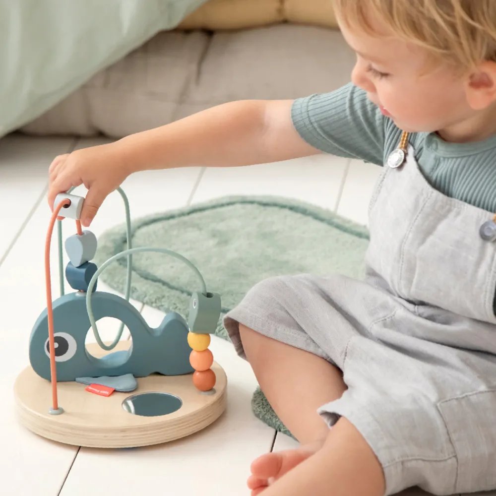 Med Wally kuglelabyrint kan dit barn flytte de små kugler og fisk fra den ene ende til den anden, og træne finmotorik og pincetgreb gennem leg. Wally og de andre hav-elementer inspirerer dit barn til at være nysgerrig på livet under vandet. De små fingre kan bevæge fisken op, ned og rundt for at udforske den i det lille spejl og barnet kan lade den svømme igennem maven på Wally. Hvalens finner er lavet i blødt, holdbart, knitrende tekstil, og bunden er designet til at stå stabilt på gulvet. Wally trækuglebanen er designet i blå nuancer med farverige detaljer. Den er fremstillet af ansvarligt produceret træ og malet med vandbaseret maling, der er fri for skadelige stoffer – hvilket gør den sikker for dit barn at bruge.