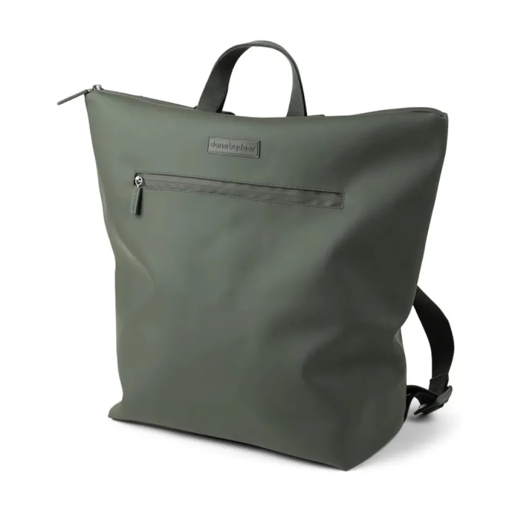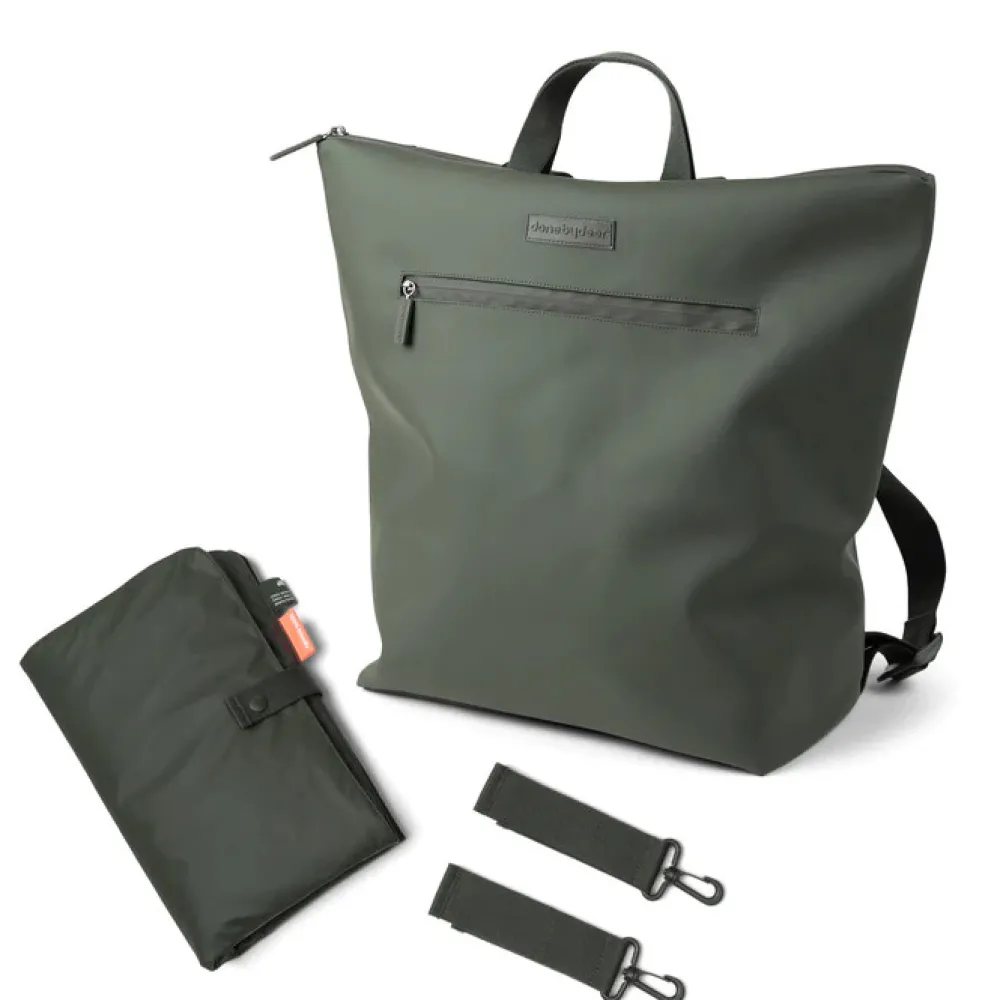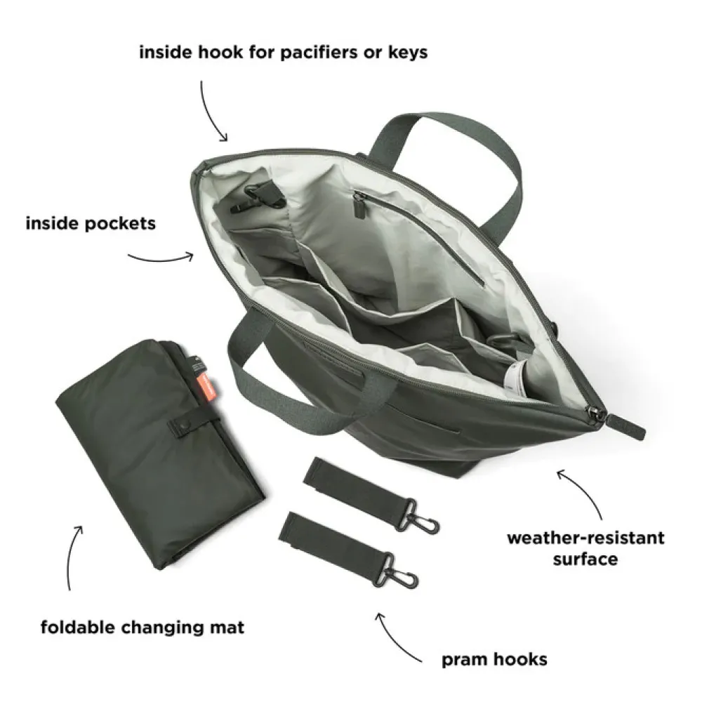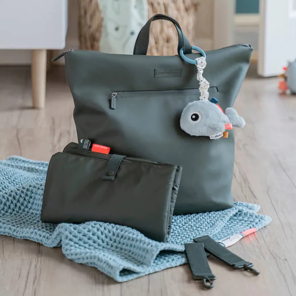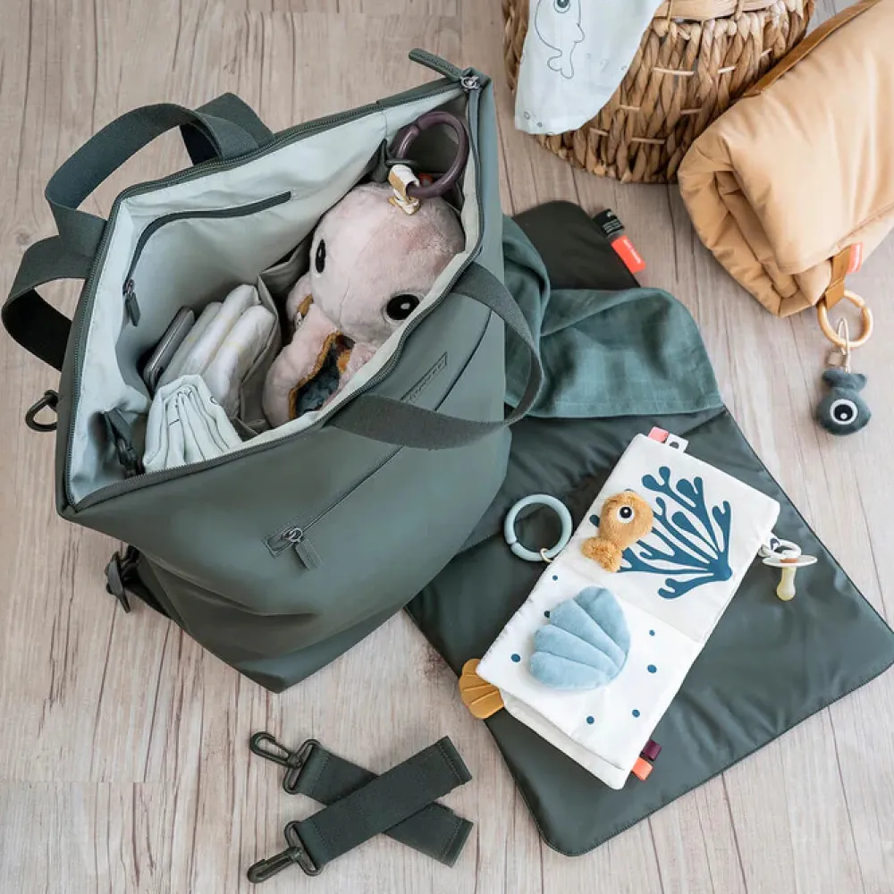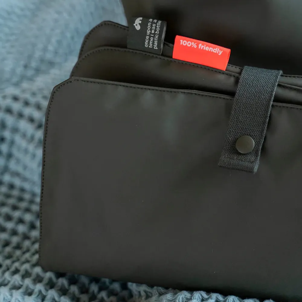 Den praktiske puslerygsæk kombinerer funktionalitet og holdbart design. 38 PET flasker genanvendes ved fremstillingen af både det ydre stof og foret på denne rummelige og praktiske puslerygsæk til alle babys nødvendigheder på farten. Den brede åbning giver let adgang til indholdet. 7 praktiske indvendige lommer og en udvendig lomme med lynlås gør organisering til en leg. To justerbare stropper giver dig mulighed for at justere pasformen og gøre rygsækken behagelig at have på. Der medfølger et foldbart og vandtæt pusleunderlag, samt to barnevogns- eller klapvognsstropper. Den vandtætte overflade og lynlåse gør at rygsækken er vejr sikker.