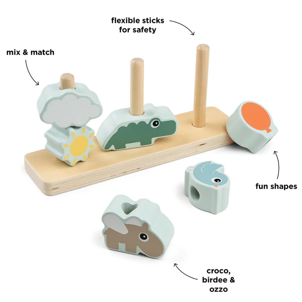 • Farverige klodser med Birdee, Croco og Ozzo inviterer dit barn til at bruge sin fantasi