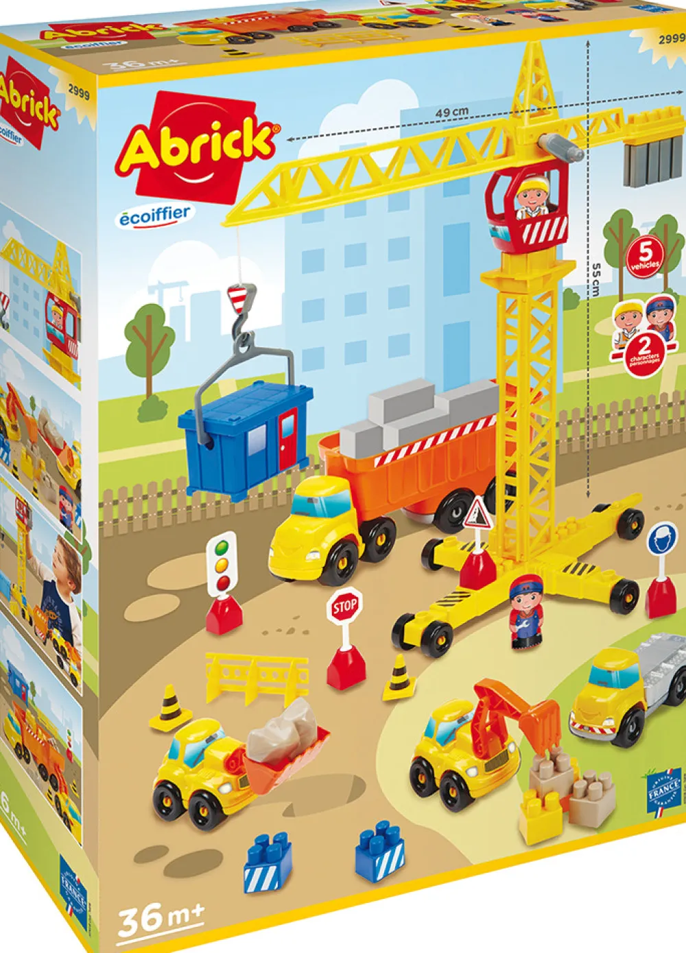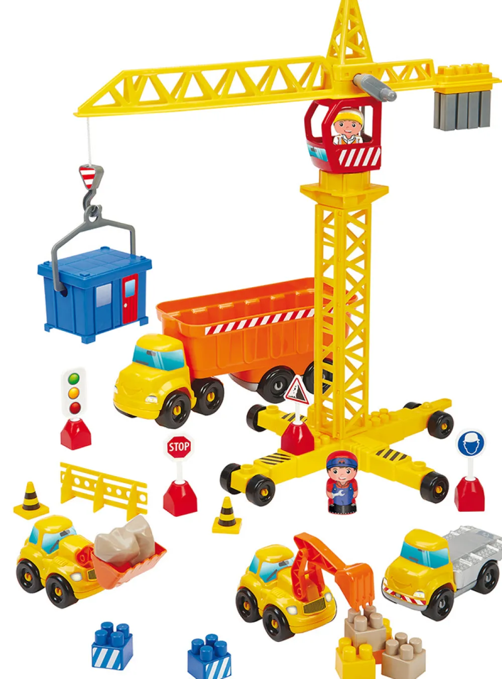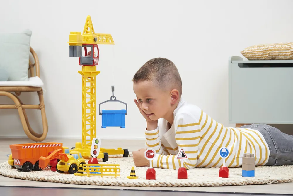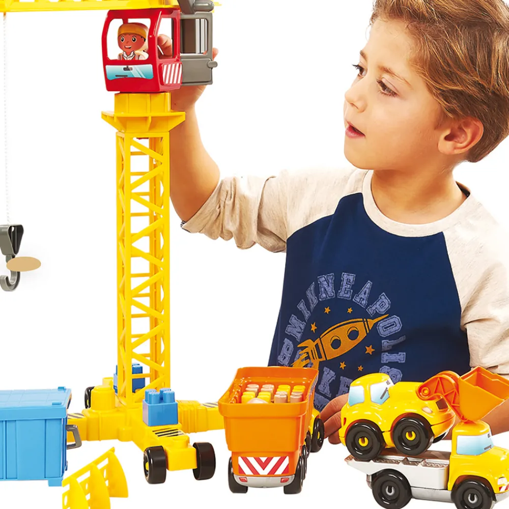 En byggeplads, der omfatter 4 køretøjer, 2 figurer, en kran, skilte og meget tilbehør.