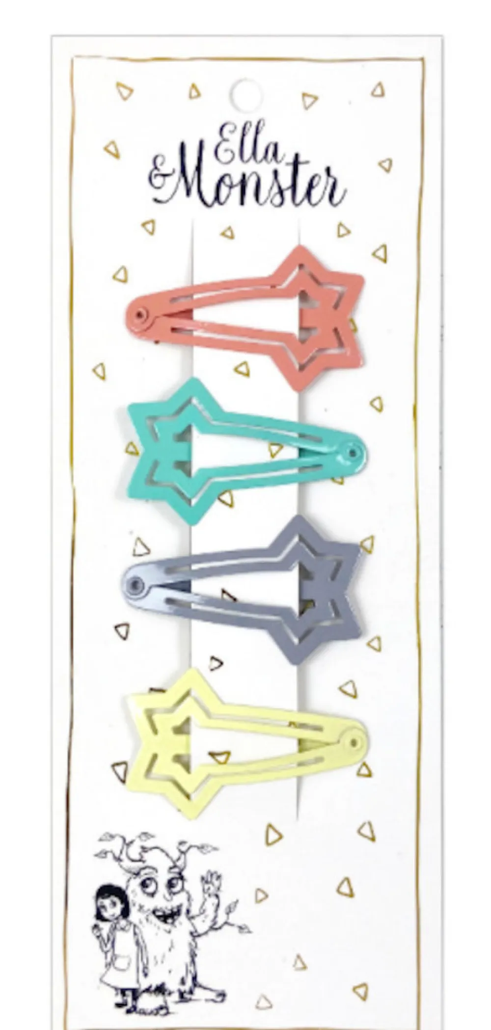 Stjernestil i fire farver! Et sæt spænder med stjerner i koral, turkis, sølv og gul – lige til at mikse og matche! Til børn der elsker farver, leg og at lyse op som dagens midtpunkt. Let at sætte i – og fuld af stjernestøv.