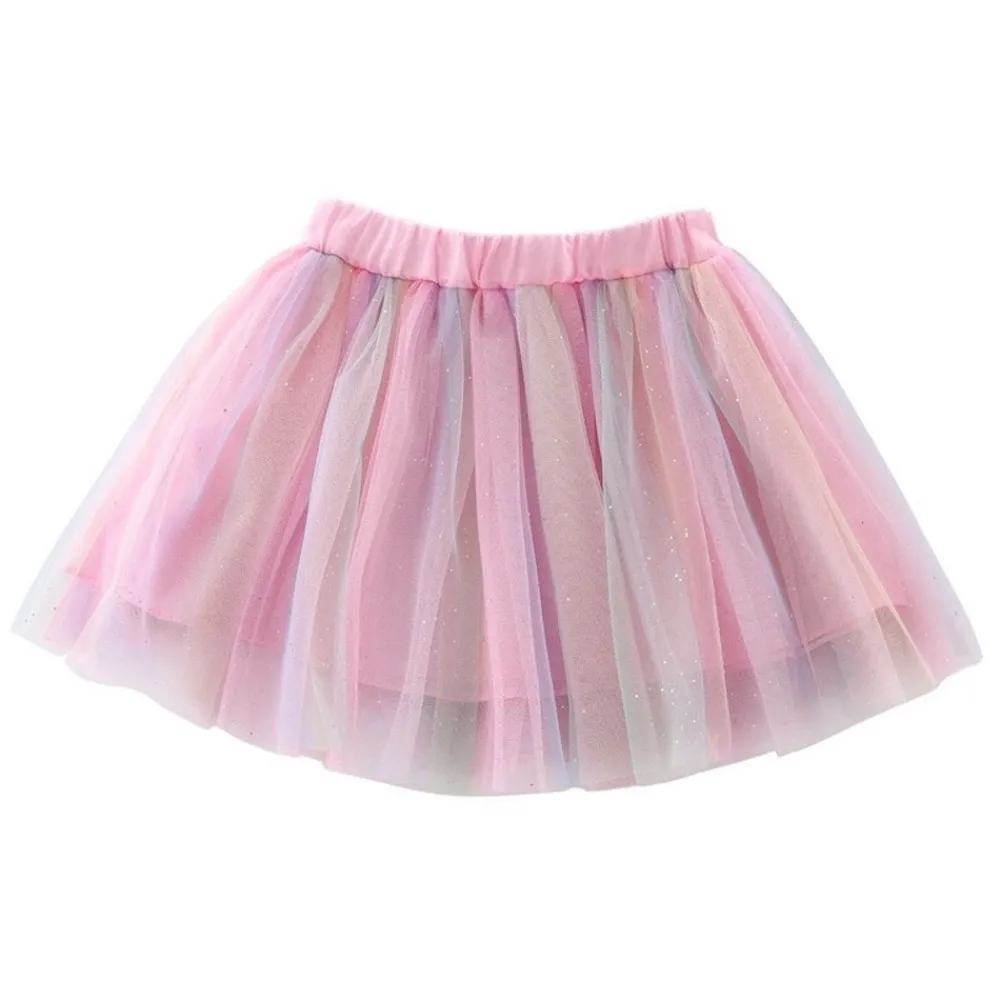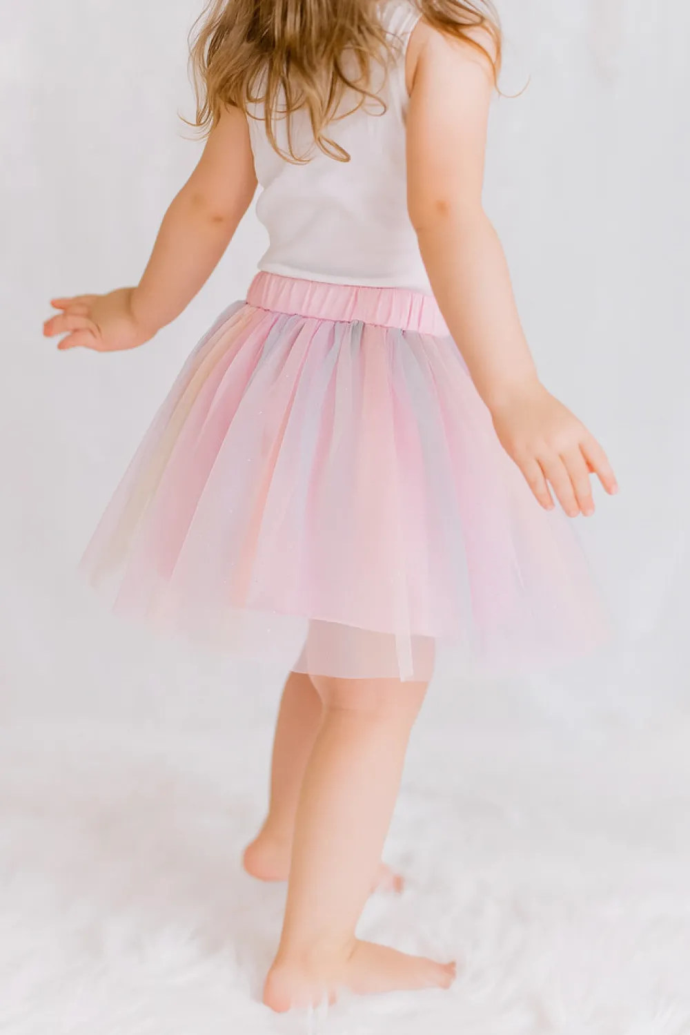 Et blødt tylskørt i de fineste pastelstriber med et glimt af glitter. Det svæver let og leger med farverne som en lille regnbue, der gør dans og fantasi endnu mere magisk. Perfekt til både leg og fest.