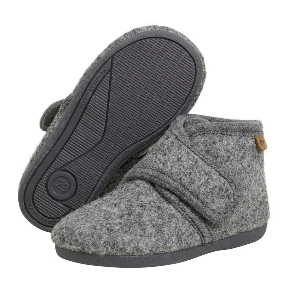Lækre uldhjemmesko fra EN FANT med gummisål. Hjemmeskoen har en velcrolukning over vristen, som sikrer optimal pasform og gør dem nemme at tage af og på. Indvendigt er sålen beklædt med uld, mens ydersålen er lavet af blødt og fleksibelt gummi, der giver et godt fodfæste på glatte overflader.
