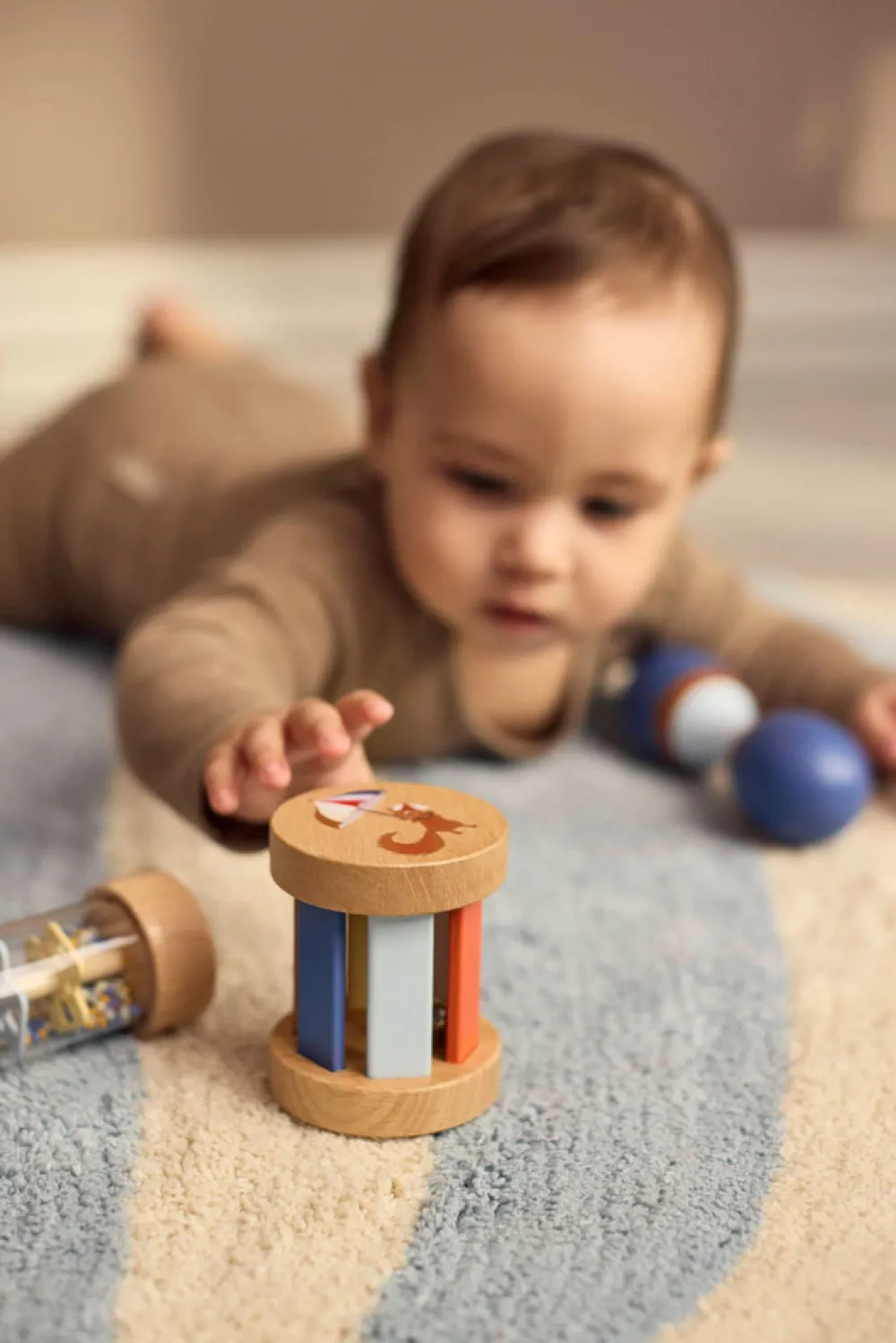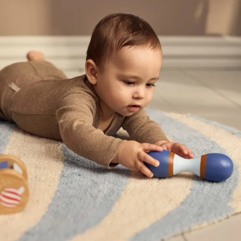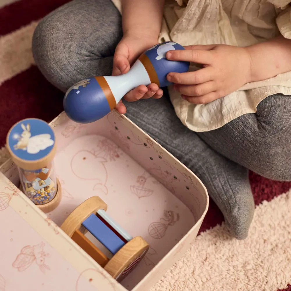 Introducer dit barn til lydens og bevægelsens vidundere med dette charmerende sæt af sanselegetøj i træ. Omhyggeligt designet til små hænder og nysgerrige sind, inspirerer sættet de små til at udforske rytme, tekstur og lyd på en engagerende og stimulerende måde. Perfekt til at fremme tidlig sanseudvikling og skabe dyrebare øjeblikke for både babyer og forældre.Sanselegetøjet leveres i en smuk kuffert, som gør det nemt at opbevare legetøjet, når det ikke er i brug, eller tage det med på farten. Den dekorative kuffert med metalhåndtag og hængsler fungerer som et smukt blikfang på dit barns værelse og kombinerer funktionalitet og charme på bedste vis.Kort om mig:- Indeholder 3 sanselegetøj: maracas, rasle med klokke og rainmaker-rasle.- Legetøjet er lavet af birk og schima-træ.- Pakket i en holdbar papkuffert med metalhåndtag og hængsler.- Fremmer sanseudvikling gennem lyd, tekstur og bevægelse.- Egnet fra: 6 måneder.