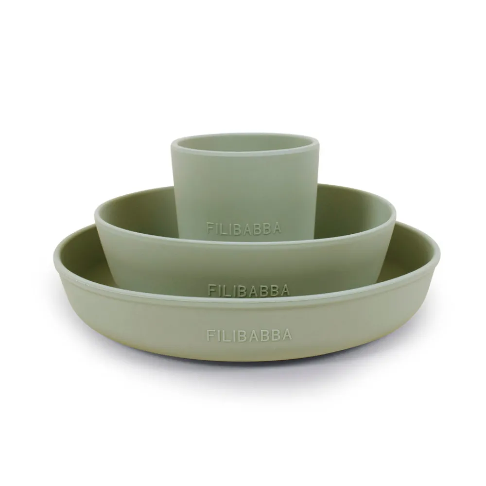 Superfint silikone-sæt som består af en kop, skål og en tallerken. Fin mellemstørrelse kop, der passer til mange størrelser børnehænder, samt både en skål og tallerken med sugekop under bunden.