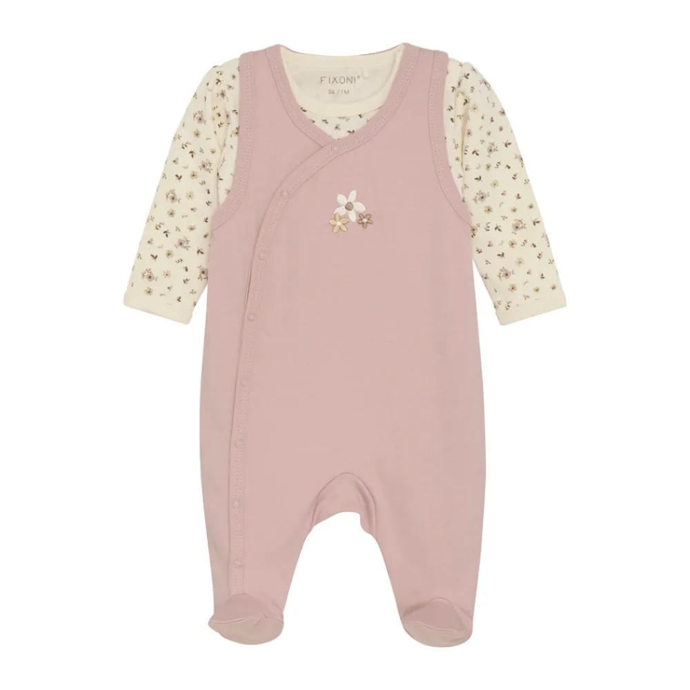Sættet består af en langærmet body og en romper med fod. Bodyen er skabt for at give optimal komfort og varme, mens den matchende romper med fod sørger for, at din baby er fuldt beskyttet fra top til tå.