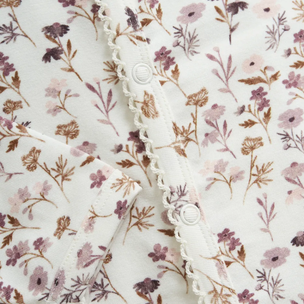 Blød heldragt med all-over-print fra FIXONI. Heldragten har praktiske trykknapper foran, som gør den nem at tage af og på – perfekt til både leg og lur.