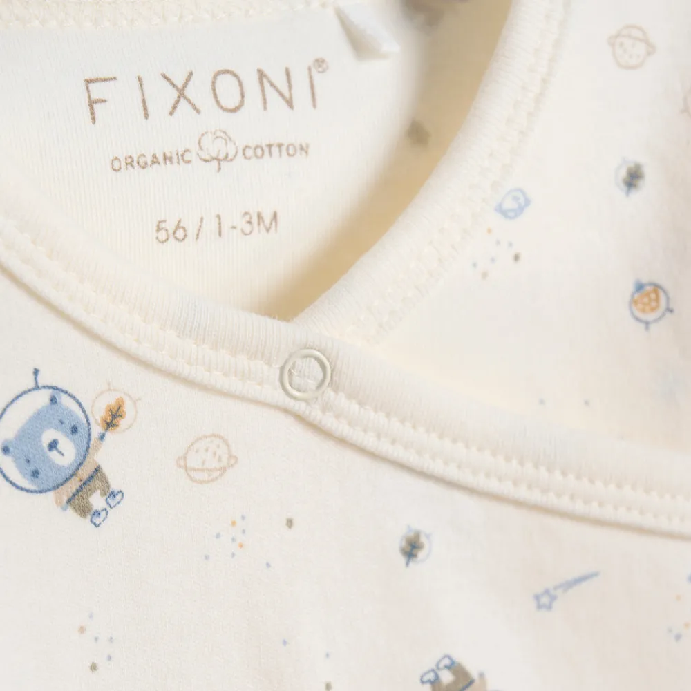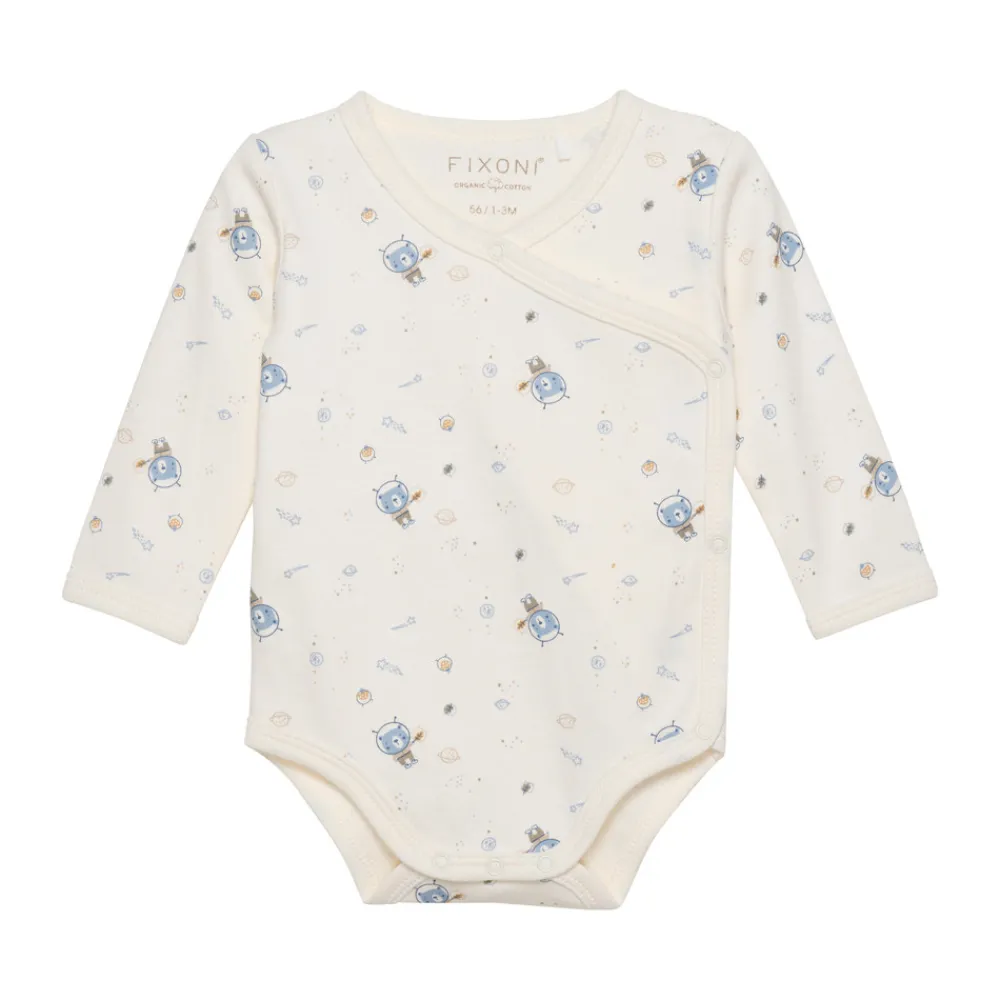 Bomuldsbody med trykknaplukning på skulderen og mellem benene samt ved slå-om-flappen i siden. Bodyen er lavet i ren, økologisk bomuld med all-over-print. Certificeret i hht. STANDARD 100 by OEKO-TEX® cert. nr. SH020 156011 TESTEX, tiltro til tekstiler