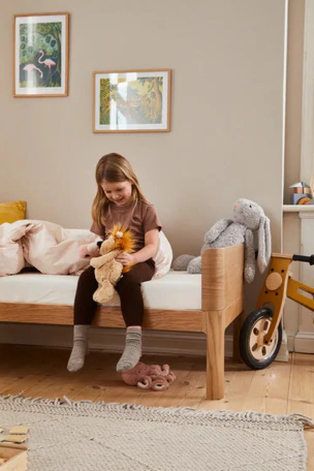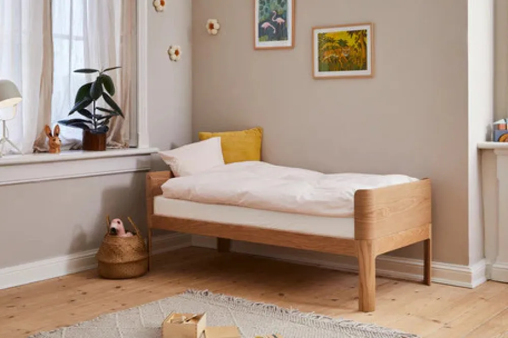 Lad dit barn sove trygt og godt i denne juniorseng med bløde, afrundede kanter. Sengen har et hovedgærde og et fodgærde og er ellers holdt i et enkelt, tidløst design for at skabe rum for ro og fordybelse. Små gennemtænkte detaljer, såsom de fine samlinger og buen på benene, får denne juniorseng til at fremstå som et venligt og velproportioneret møbel. Juniorsengen er fremstillet af FSC™-certificeret træ og er en del af FLEXA Nova-kollektionen – en serie af fleksible børnemøbler, der er designet af den prisvindende designer Charlotte Høncke.
