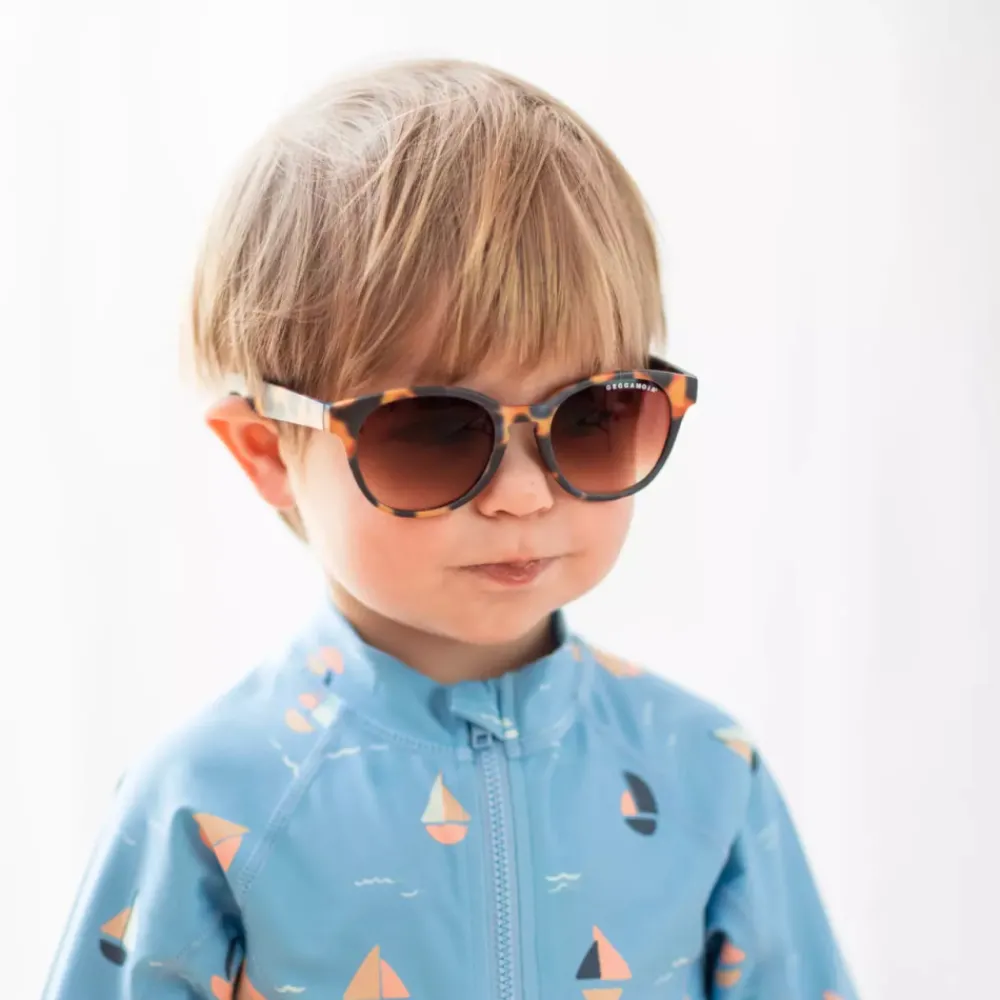 Seje brune solbriller fra Geggamoja. Bløde og fleksible i silikone, så de kan holde til børns uforsigtige behandling. Elastikbånd til at sætte rundt om hovedet, så de sidder på plads. Elastikbåndet kan tages af ved hjælp af spænder i enderne af brillestængerne og kan justeres for perfekt pasform.