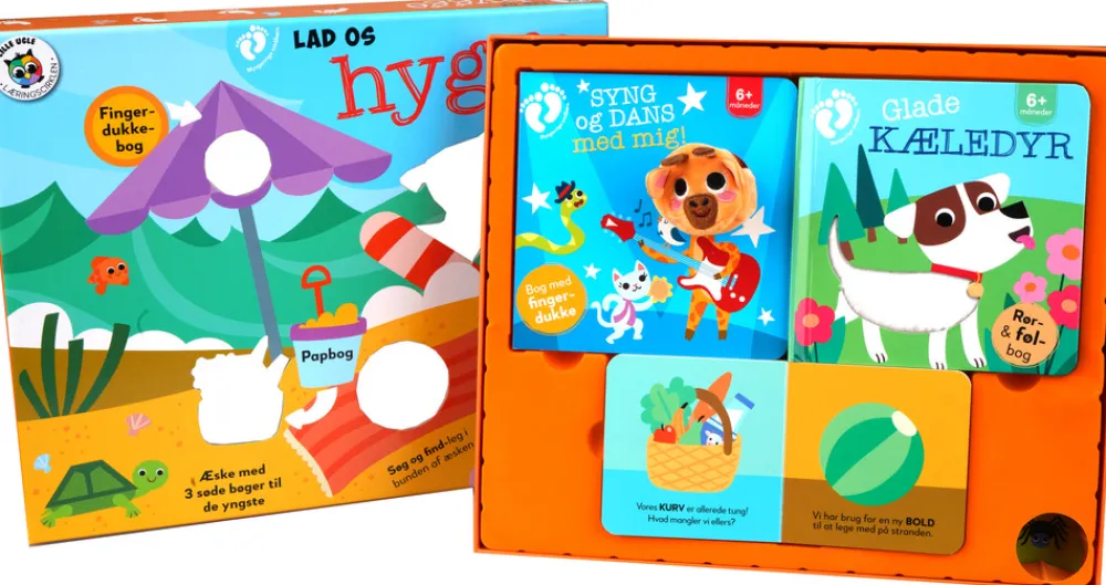 Æsken indeholder en papbog, en papbog med fingerdukke og en rør og føl-bog