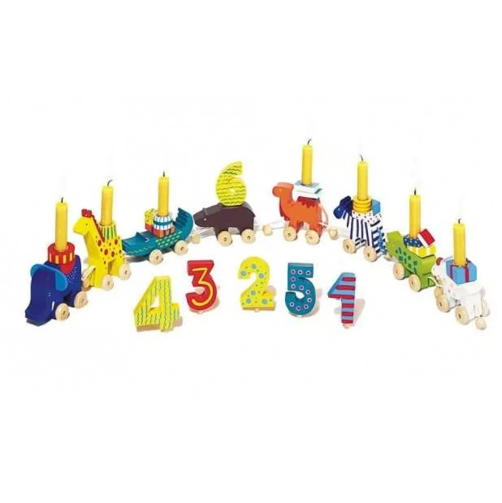 Fødselsdagstog i cirkus tema. Sjove dyr i flotte farver. Toget leveres med tallene 1 – 6. Lys medfølger ikke.