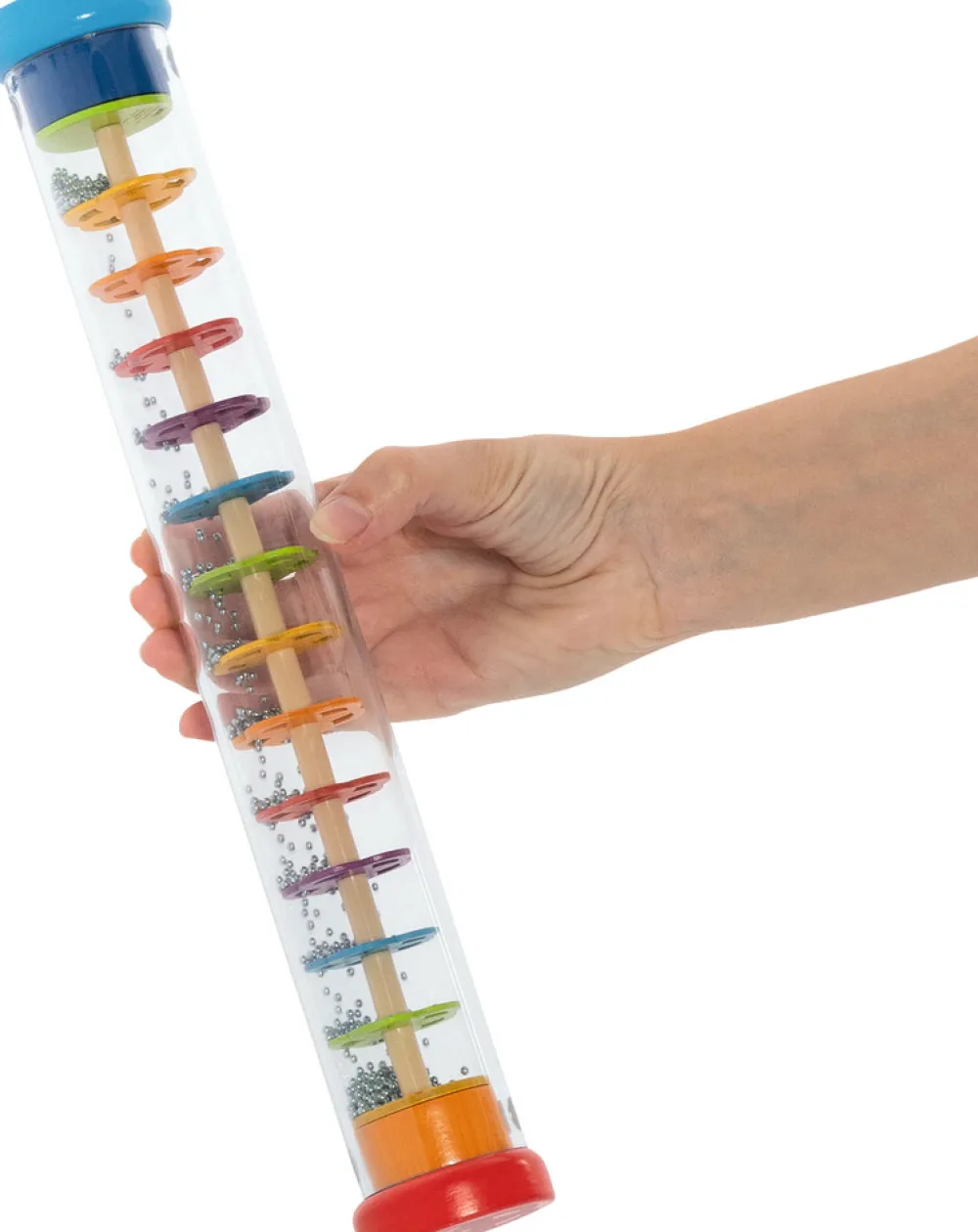 Regnstaven er fyldt med små kugler og farverige ringe. Nyd den beroligende lyd imens du ser kuglerne falde fra toppen til bunden.