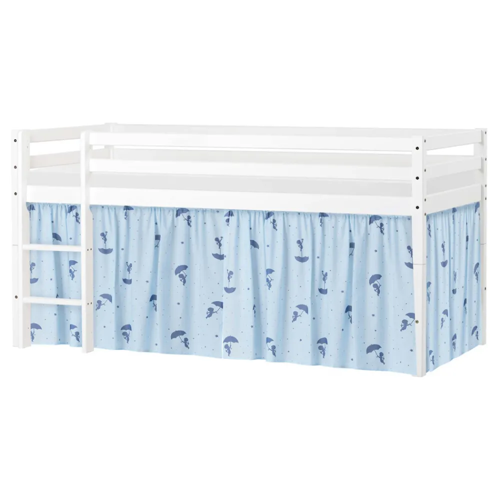 Med denne seng fra Hoppekids får man både ECO Dream juniorsengen og et modul så den kan bygges til en smart og sej halvhøj seng. Sengen giver mere gulvplads til leg og mulighed for at lave en hyggelig hule under sengen. Med en størrelse på hele 90×200 cm. bliver Hoppekids juniorsengen en god base til barnet for en god og tryg nattesøvn. Denne fine og enkle halvhøj juniorseng fra Hoppekids giver mange muligheder og er derfor mere end bare en seng. ECO Dream halvhøj seng er en smart seng til dem der virkelig ønsker at have lege eller opbevaringsplads under sengen. Hvis behovet opstår hvor der ikke er brug for en halvhøj seng, er det lige til og enkelt at lave den om til en juniorseng – sengen er nemlig delbar. Den store størrelse 90×200 cm giver masser af plads til at vokse på og barnet kan bruge sengen helt indtil de er klar til et teenageværelse. Størrelsen giver samtidig mulighed for at en forælder kan ligge i sengen, fx hvis der skal læses godnathistorie. Med mulighed for disse løsninger, betyder det at sengen vokser med barnets og dets behov. Det håndsyede forhæng fra Hoppekids skaber en magisk og eventyrlig verden lige midt i børneværelset. Når forhænget monteres på sengen, er det ikke længere en seng, men en hyggelig hule med det fineste print af Ole Lukøje, hvor det er fantasien, der bestemmer. Det søde univers fra Ole Lukoie inviterer dit barn på eventyr i en spændende verden fyldt med fantasifulde historier. Forhænget skaber også en hyggelig hule under den halvhøje seng, som er perfekt til leg eller når dit barn har brug for en lille pause fra resten af verden. Dekorér eventuelt hulen med en madras, tæpper, puder, lyskæder og andre hyggelige sager.