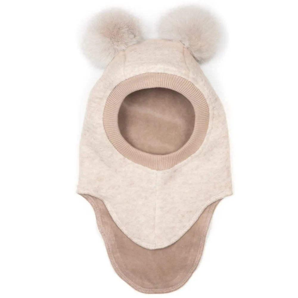 Sød Huttelihut elefanthue i meleret uldkvalitet med alpaca kvaste på toppen. Huttelihut elefanthuen har en rund hovedform og en elastisk ribkant omkring ansigtet, så huen er lukker godt til. Huen har en praktisk spliteffekt med ekstra længde i nakken. Huttelihut elefanthuen er i to lag med velour i indersiden.