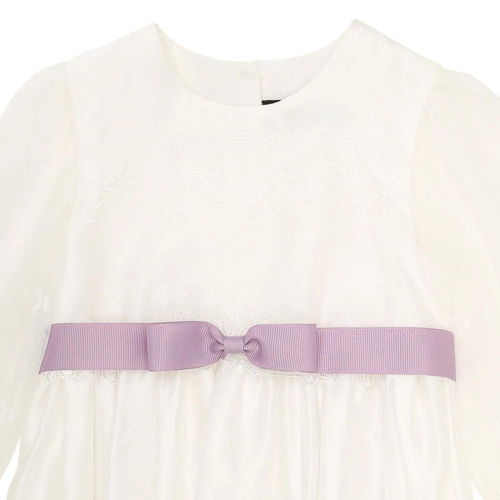 Dåbssløjfe i riflet satin som bindes på ryggen. Den forknyttet sløjfe fæstnes foran i taljen med medfølgende sikkerhedsnål. Bredde 3 cm.