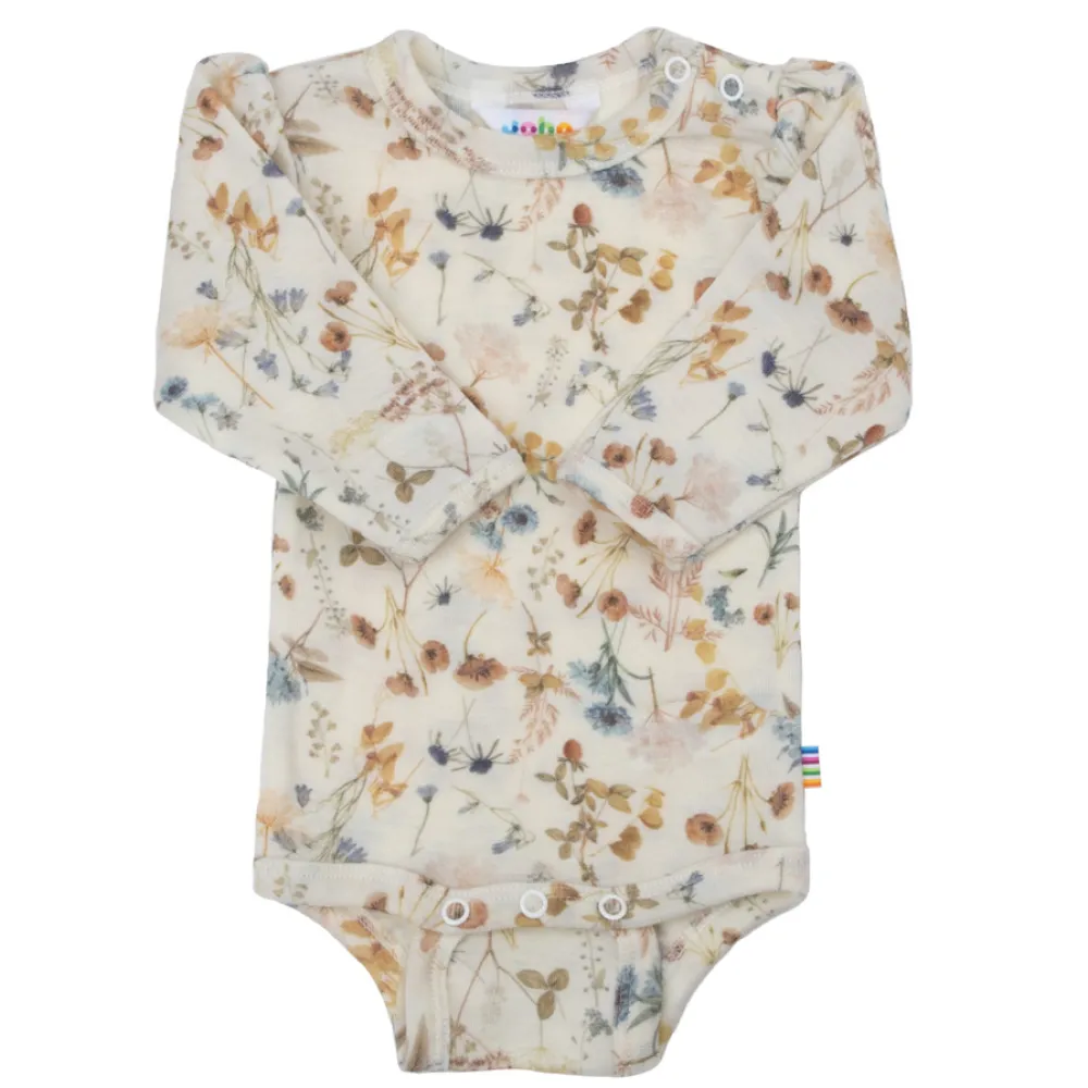 Langærmet body med praktiske trykknapper på den ene skulder og mellem benene, som gør den nem at tage af og på. Fremstillet i en let, superblød og elastisk kvalitet af ren merinould, der føles behagelig mod huden hele dagen. Det smukke digitale print med efterårsblomster giver et sødt og sæsoninspireret udtryk.