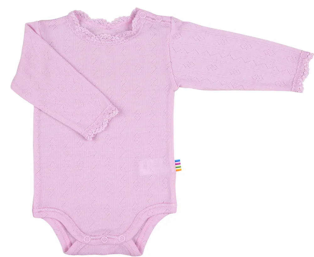 Body med lange ærmer. Blondekant ved halsen og på ærmer. Trykknapper på den ene skulder samt mellem benene. Ekstra fin uldkvalitet med silke. Utrolig blød med et lidt skinnende udtryk og sødt hulmønster. Ensfarvet. Wool rich blend og Oeko-tex 100 mærket.