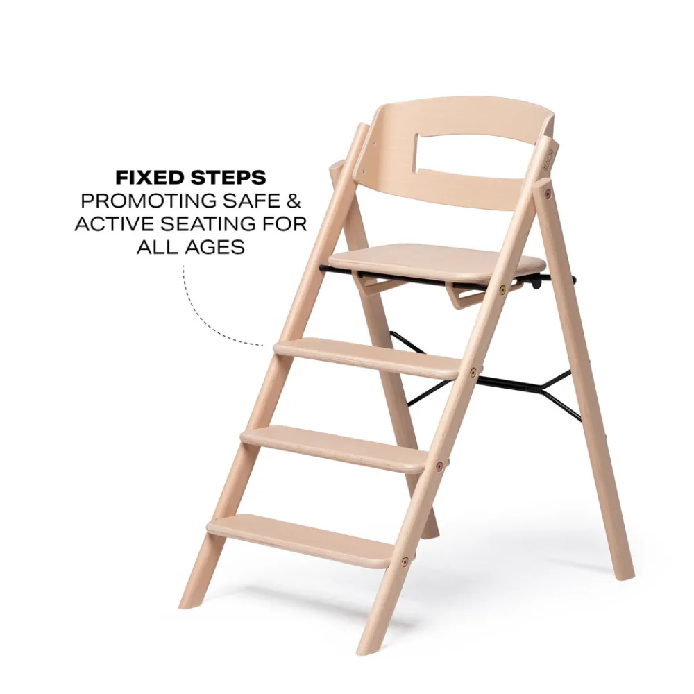 KAOS Klapp højstolen vil være en smuk tilføjelse rundt om spiseborderet. Dens foldbare design gør den til en fantastisk pladsbesparende højstol, der også er perfekt bærbar lige til at tage med sig. De faste stigetrin er unikke og gør det nemt for barnet at klatre op og ned af KAOS Klapp højstolen på egen hånd. Barnet får en ergonomisk og aktiv siddeplads og hviler benene naturligt ved de forskellige trin, når de vokser. KAOS Klapp højstol til børn kommer færdig samlet i æsken. Bare fold stolen ud, klik sædet i låseposition, og den er klar til brug. Den er nem at holde ren på grund af dens glatte og solide finish. Klapp er en moderne designklassiker, der holder hele barndommen. En strålende investering, fra håndværk af høj kvalitet og førsteklasses materialer. KAOS Klapp er designet af den prisvindende norske produktdesigner Ole Petter Wullum.