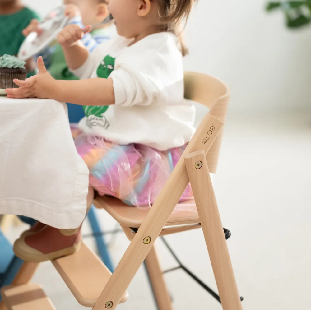 KAOS Klapp lader barnet sidde behageligt og varieret ved bordet sammen med resten af familien. Dette er med til at fremme barnets følelsesmæssige og sociale udvikling under måltiderne.