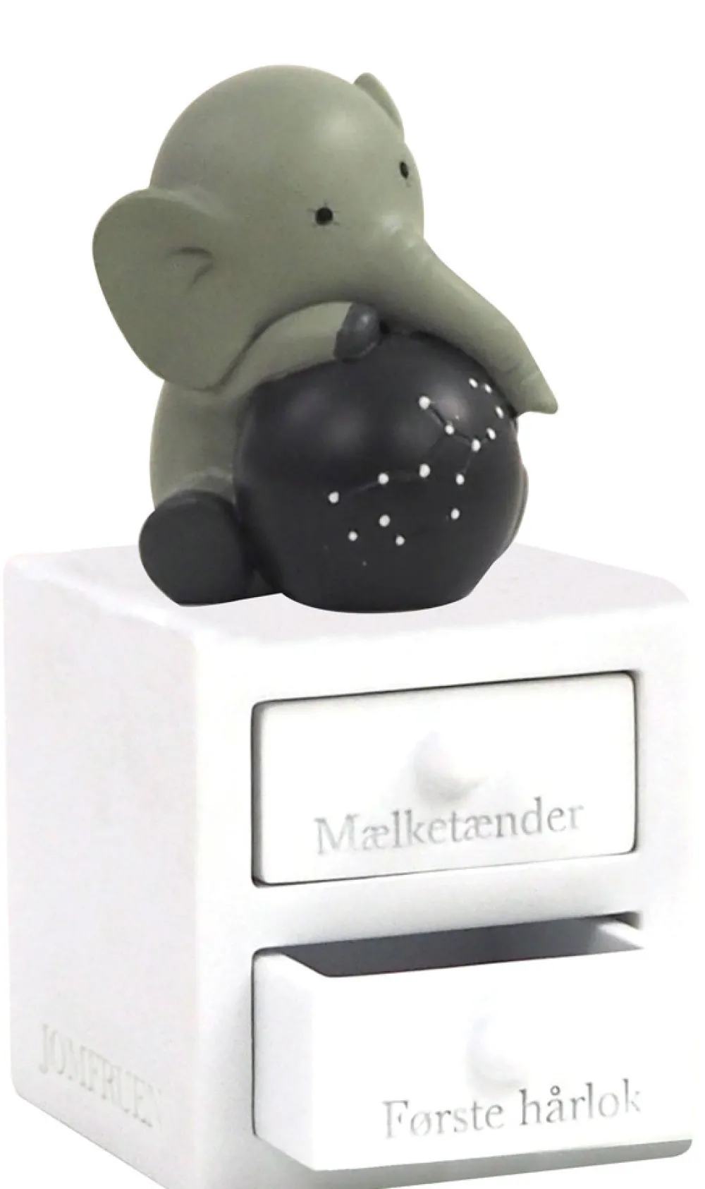 Første tand og hårlok æske med jomfruen stjernetegn, med planet og stjernebillede, som lyser i mørket. Figuren har to skuffer – En til første tand og en til hårlok. Super fin dåbsgave ide. Æsken er håndmalet så der kan være variationer.