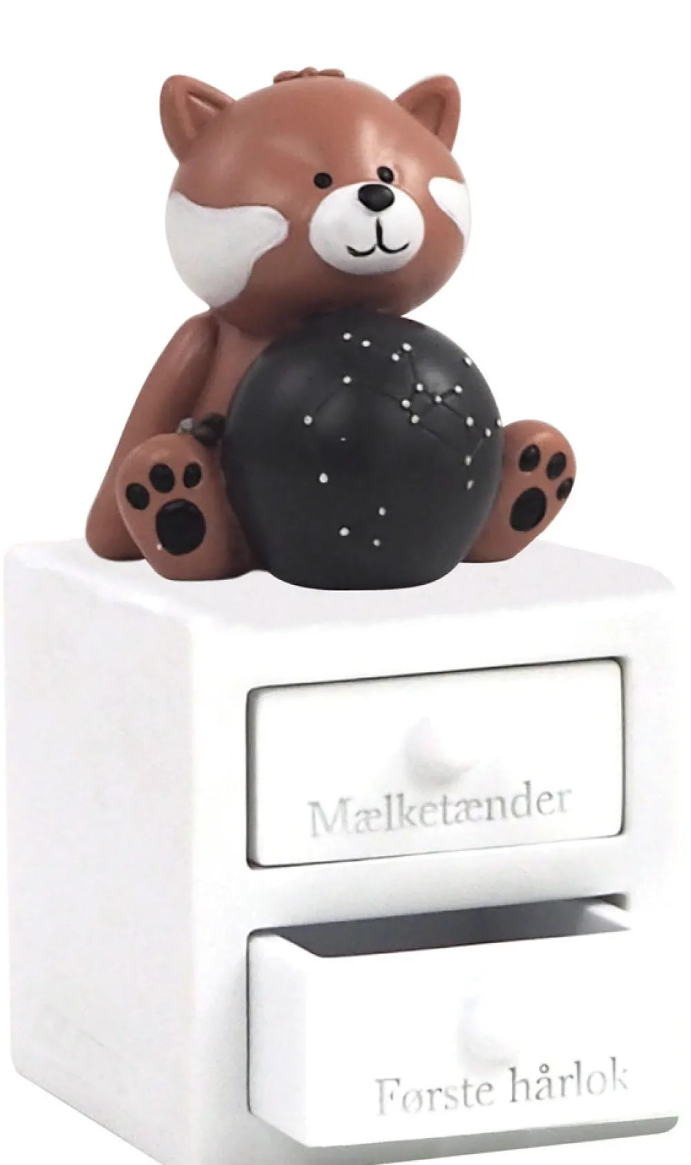 Første tand og hårlok æske med skytten stjernetegn, med planet og stjernebillede, som lyser i mørket. Figuren har to skuffer – En til første tand og en til hårlok. Super fin dåbsgave ide. Æsken er håndmalet så der kan være variationer.