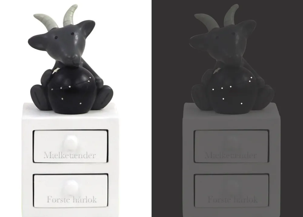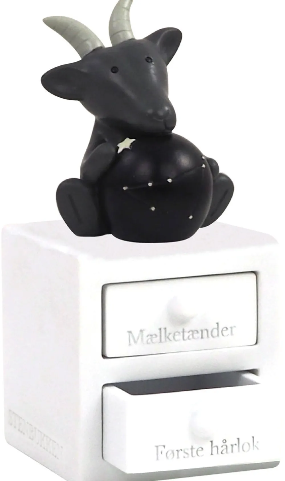 Første tand og hårlok æske med stenbukken stjernetegn, med planet og stjernebillede, som lyser i mørket. Figuren har to skuffer – En til første tand og en til hårlok. Super fin dåbsgave ide. Æsken er håndmalet så der kan være variationer.