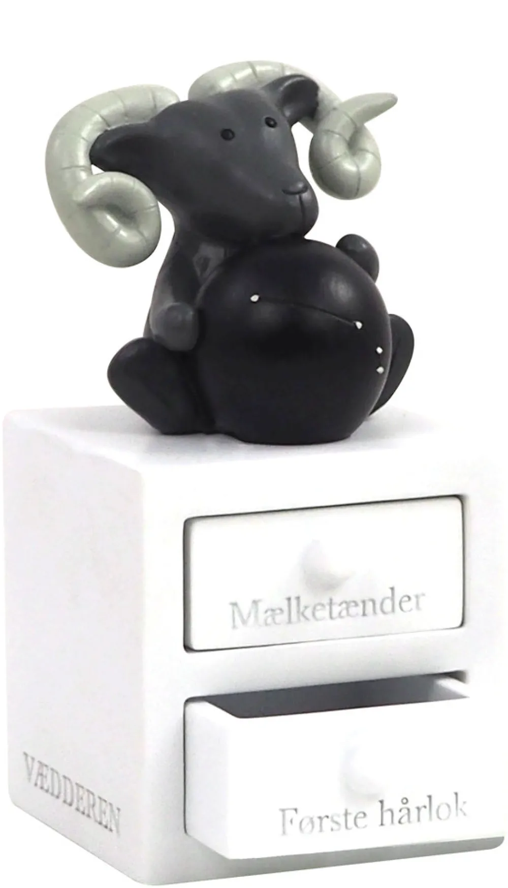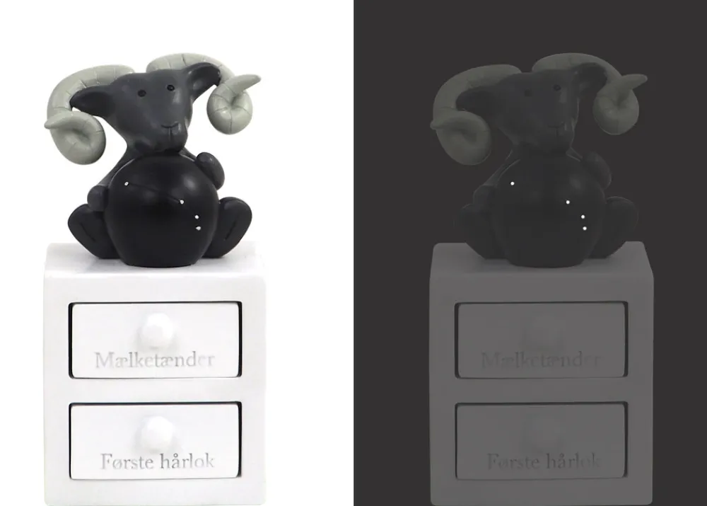 Første tand og hårlok æske med vædderen stjernetegn, med planet og stjernebillede, som lyser i mørket. Figuren har to skuffer – En til første tand og en til hårlok. Super fin dåbsgave ide. Æsken er håndmalet så der kan være variationer.