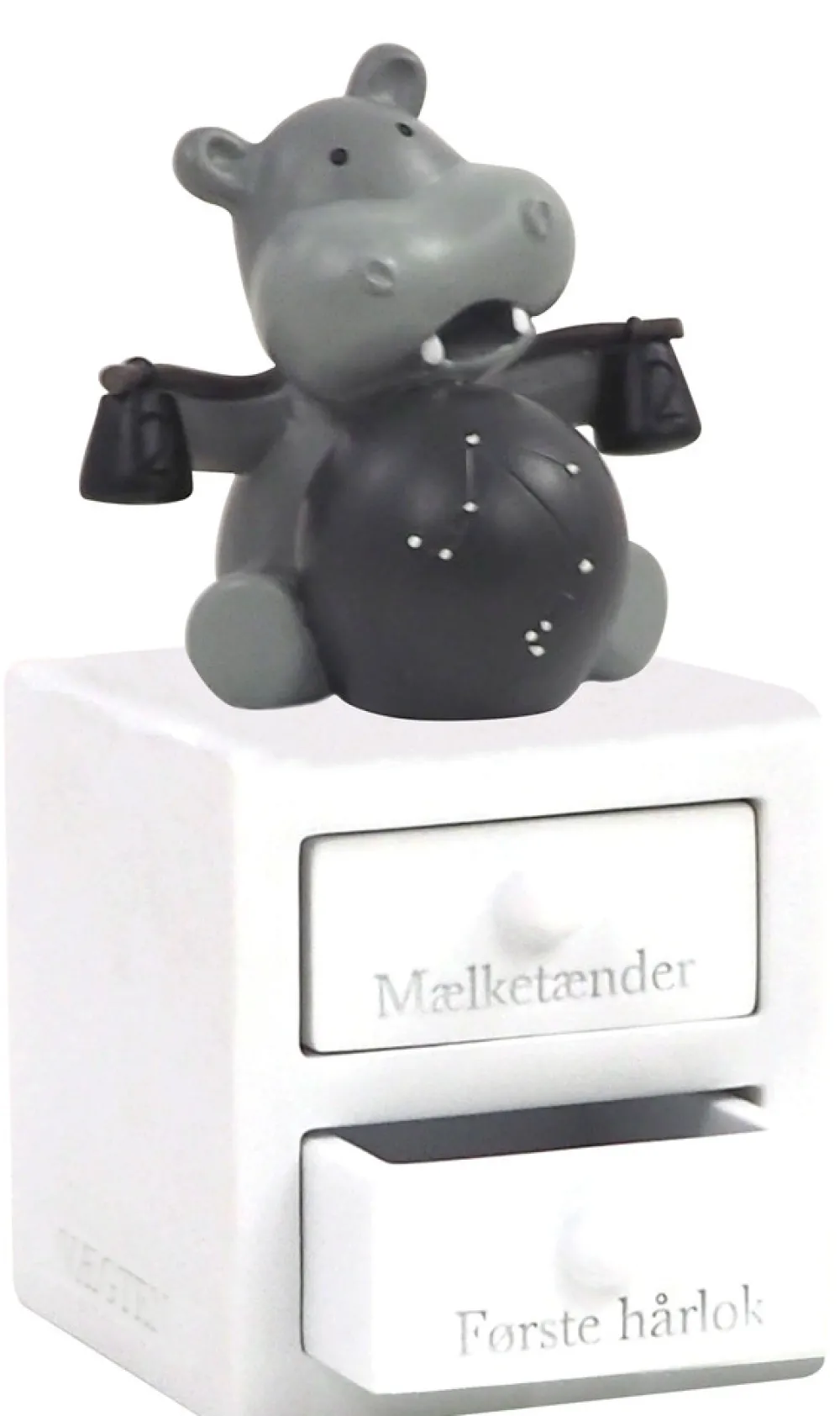 Første tand og hårlok æske med vægten stjernetegn, med planet og stjernebillede, som lyser i mørket. Figuren har to skuffer – En til første tand og en til hårlok. Super fin dåbsgave ide. Æsken er håndmalet så der kan være variationer.
